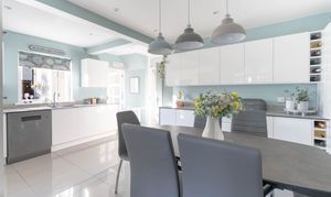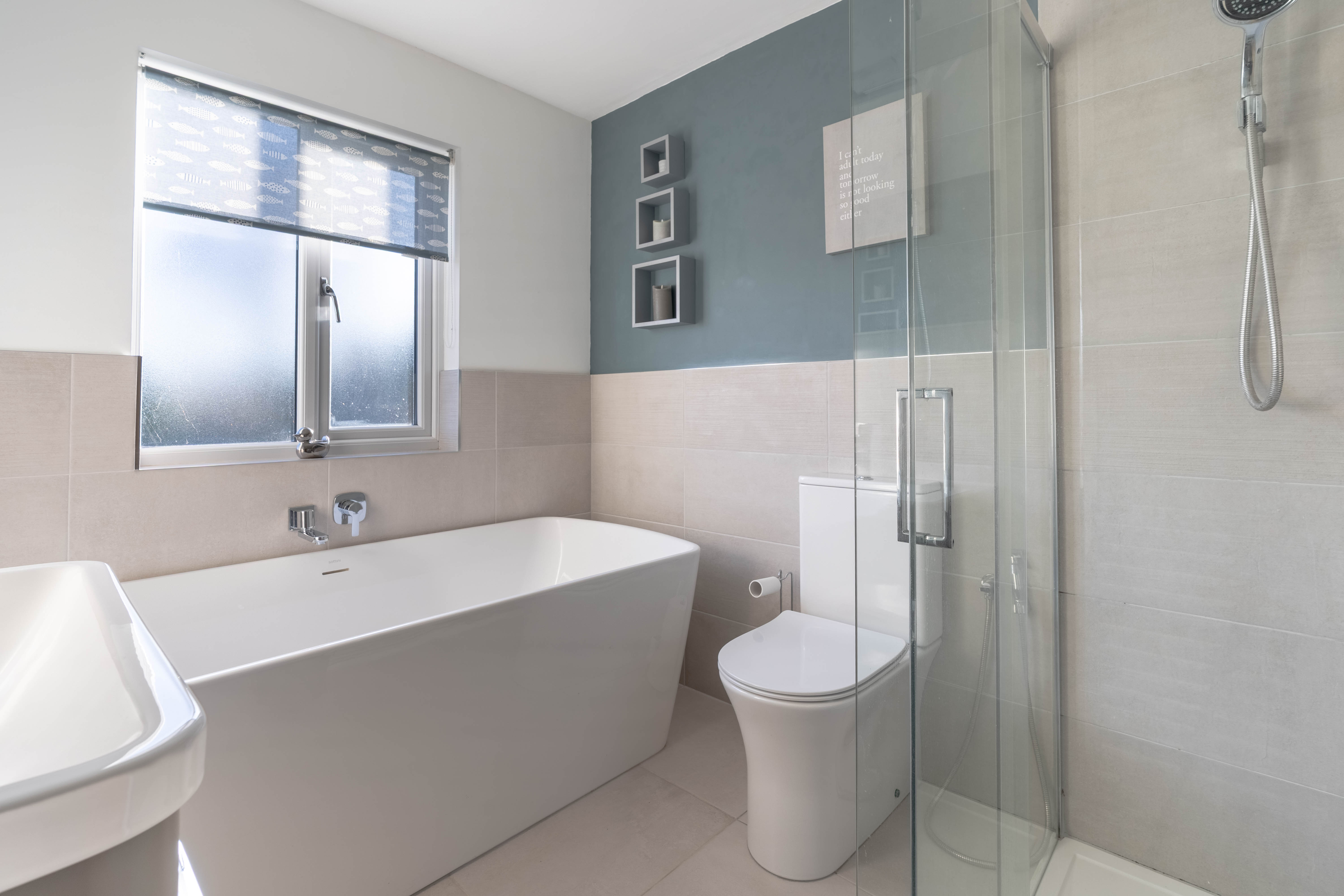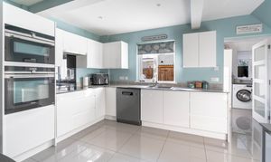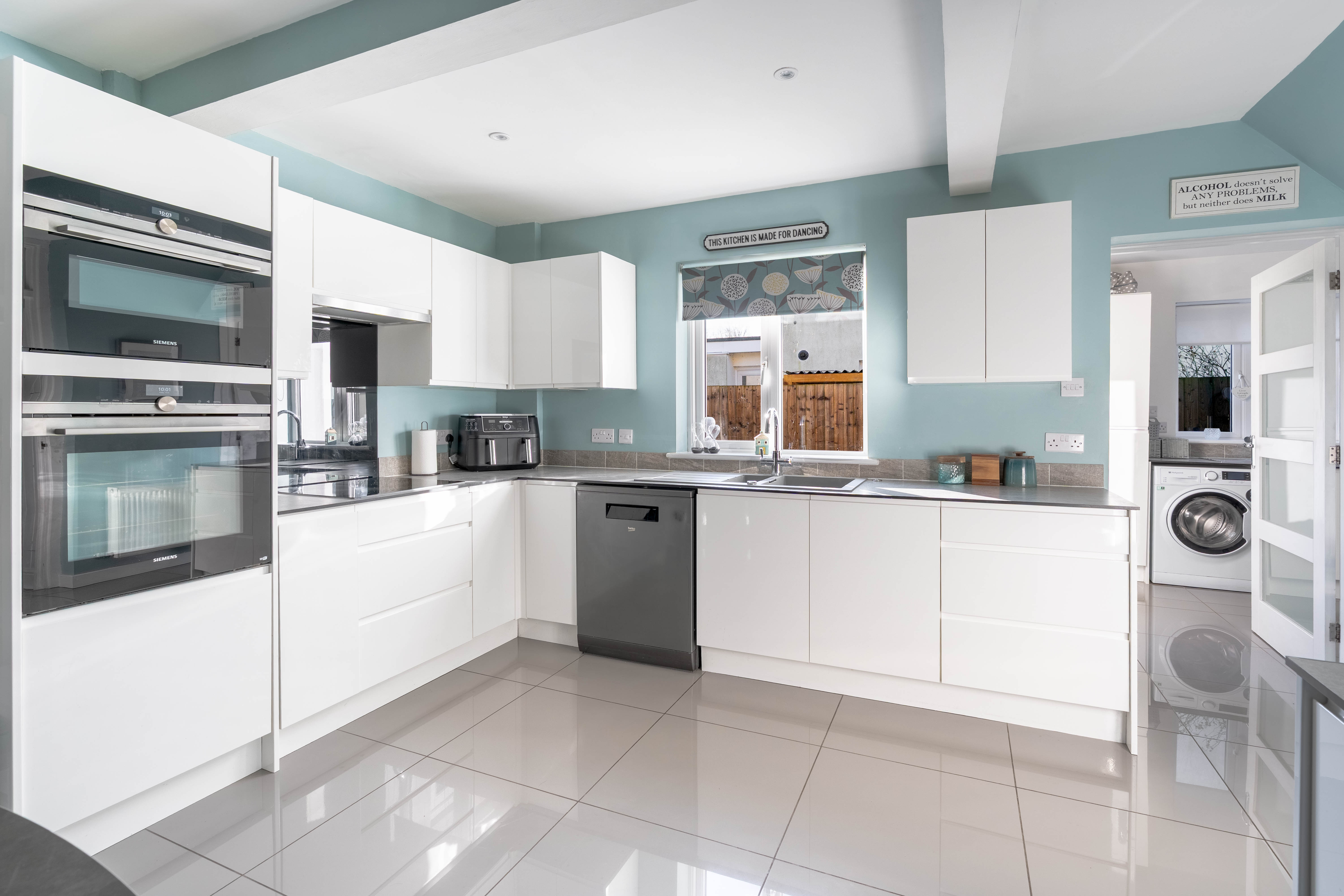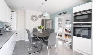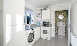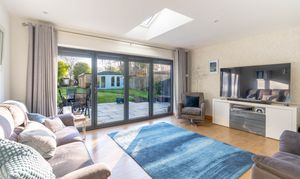 The entrance hall provides access to the first-floor staircase with useful understairs storage. From here, there is access to the front sitting room, which has previously been used as a ground-floor bedroom. Positioned at the front of the property, this room features a large picture window and an attractive exposed brick chimney breast with a gas stove and shelving set into the recess. The impressive open-plan kitchen is a real highlight of the home, offering a comprehensive range of high-gloss wall and base units complemented by ample work surfaces. Appliances include a Siemens induction hob with matching extractor and glass splashback, a double built-in oven, and plumbing for a dishwasher. Adjoining the kitchen is a useful separate utility room, providing additional storage, space for a washing machine and tumble dryer, a wall-mounted gas boiler, and direct access to the garden. The ground floor also benefits from a modern WC. Completing the ground floor accommodation is a fantastic additional reception room, offering a second, generously sized sitting room with bi folding doors accessing the garden and a sky light inset to the ceiling, a room that enhances the flexibility and appeal of the property.