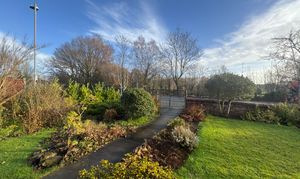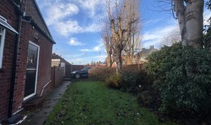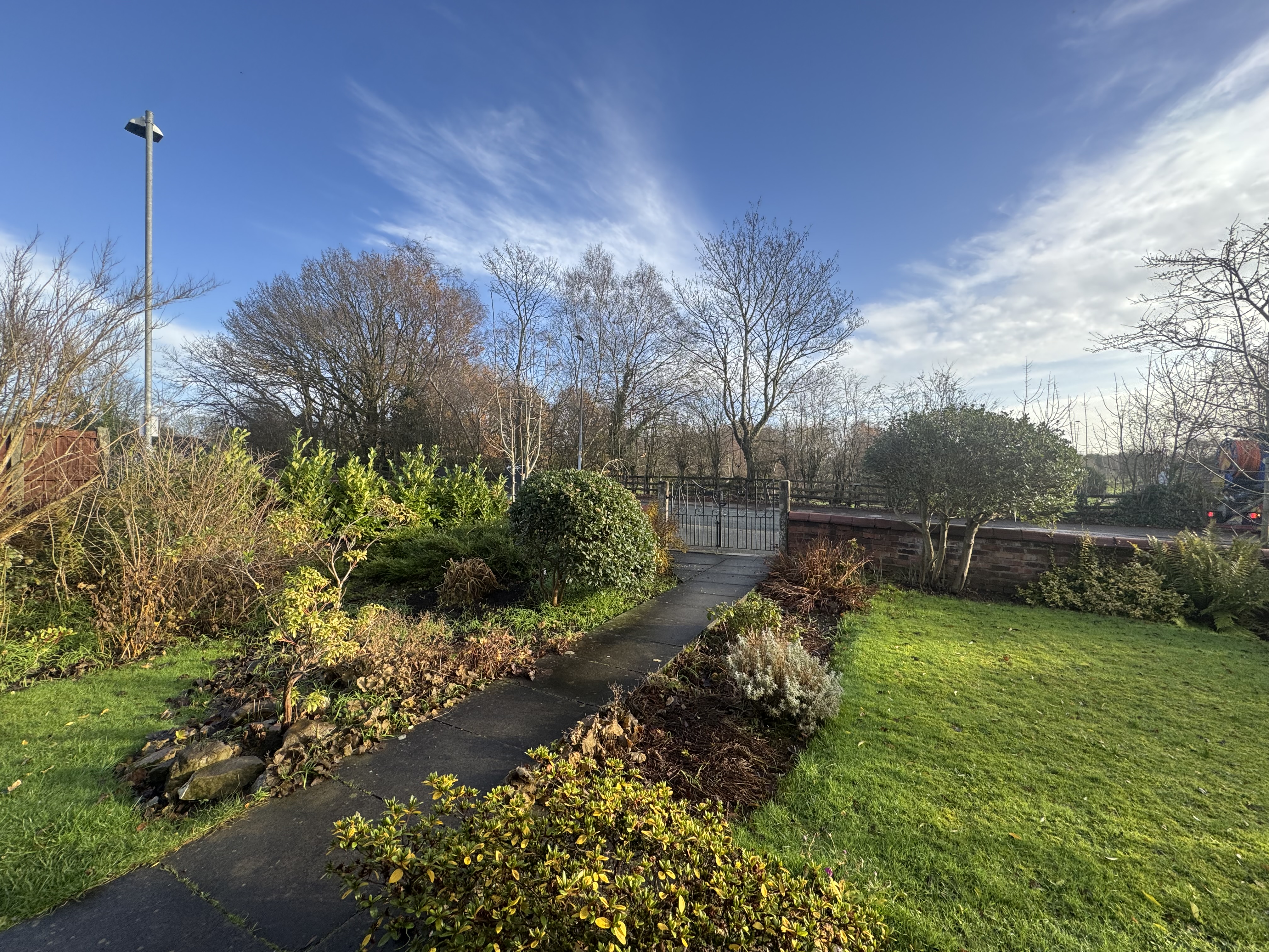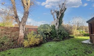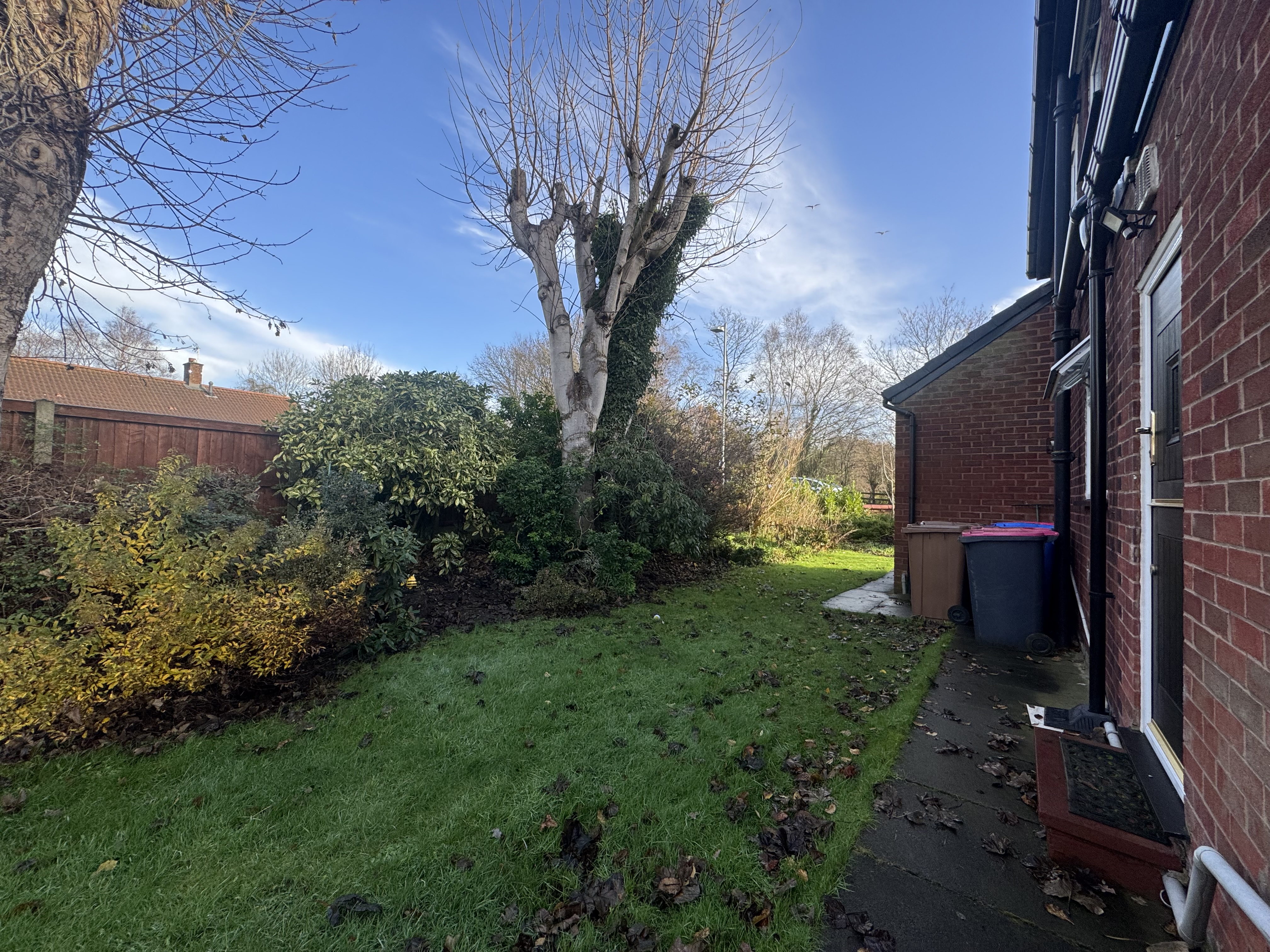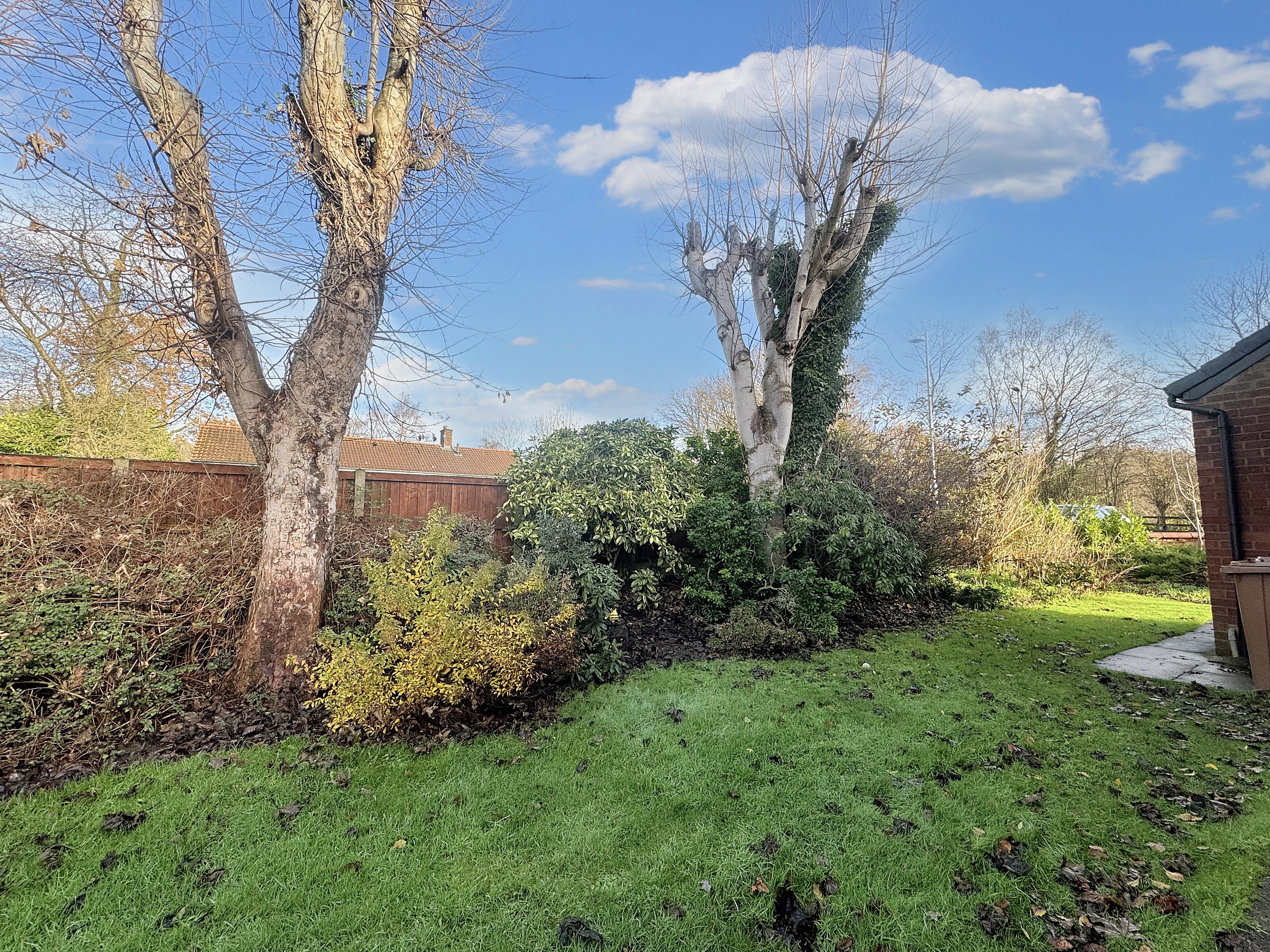 Rear, side and front gardens on a deceptive corner plot with neat lawns, mature trees and a patio area to the rear.