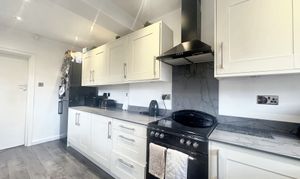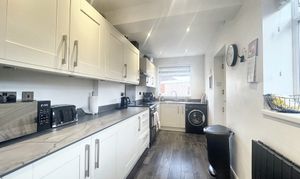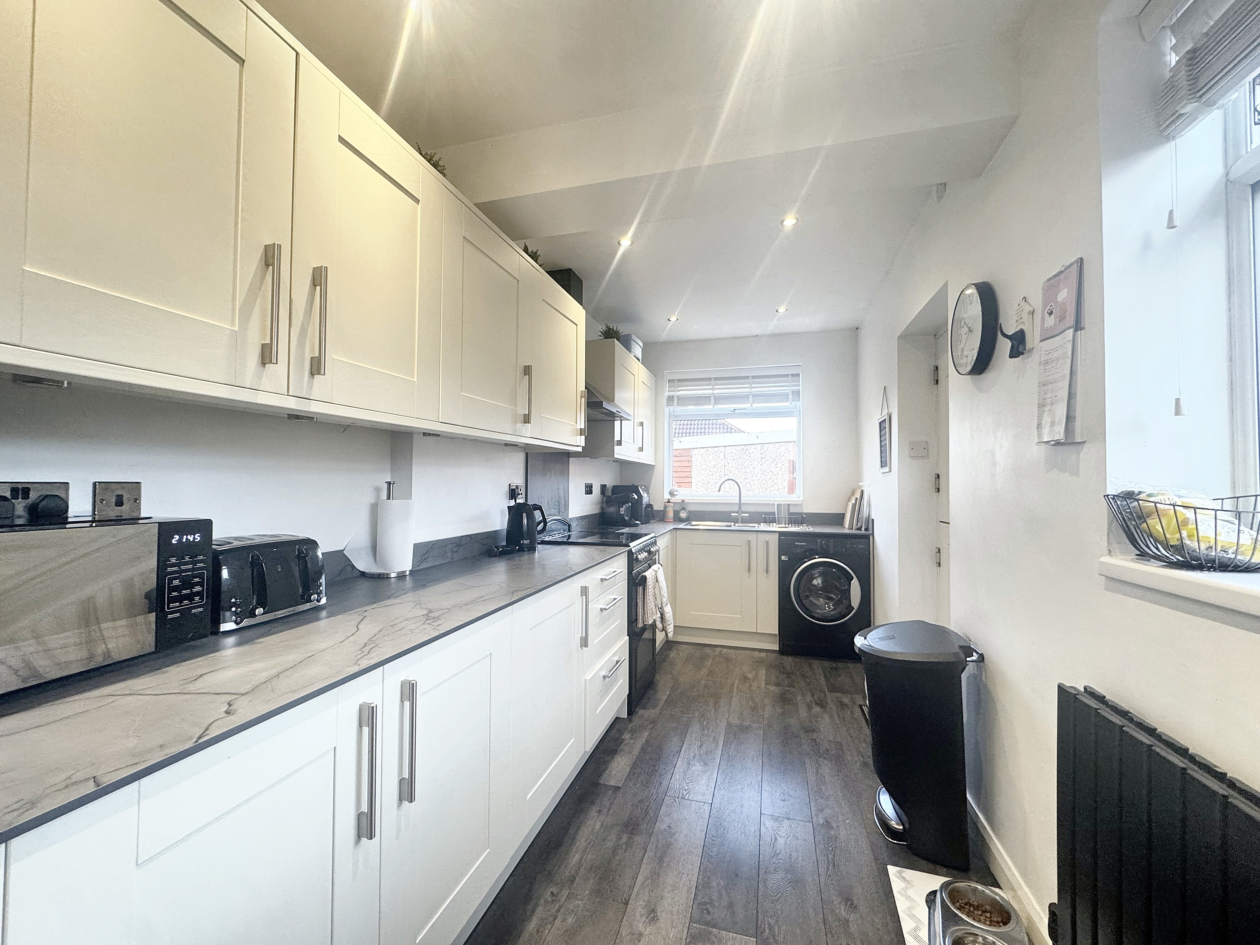 Window to the rear and side elevation. A range of wall and base units with contrasting work surfaces with space for a fridge/freezer, oven and washing machine. Spot lights. Back door to the side elevation.