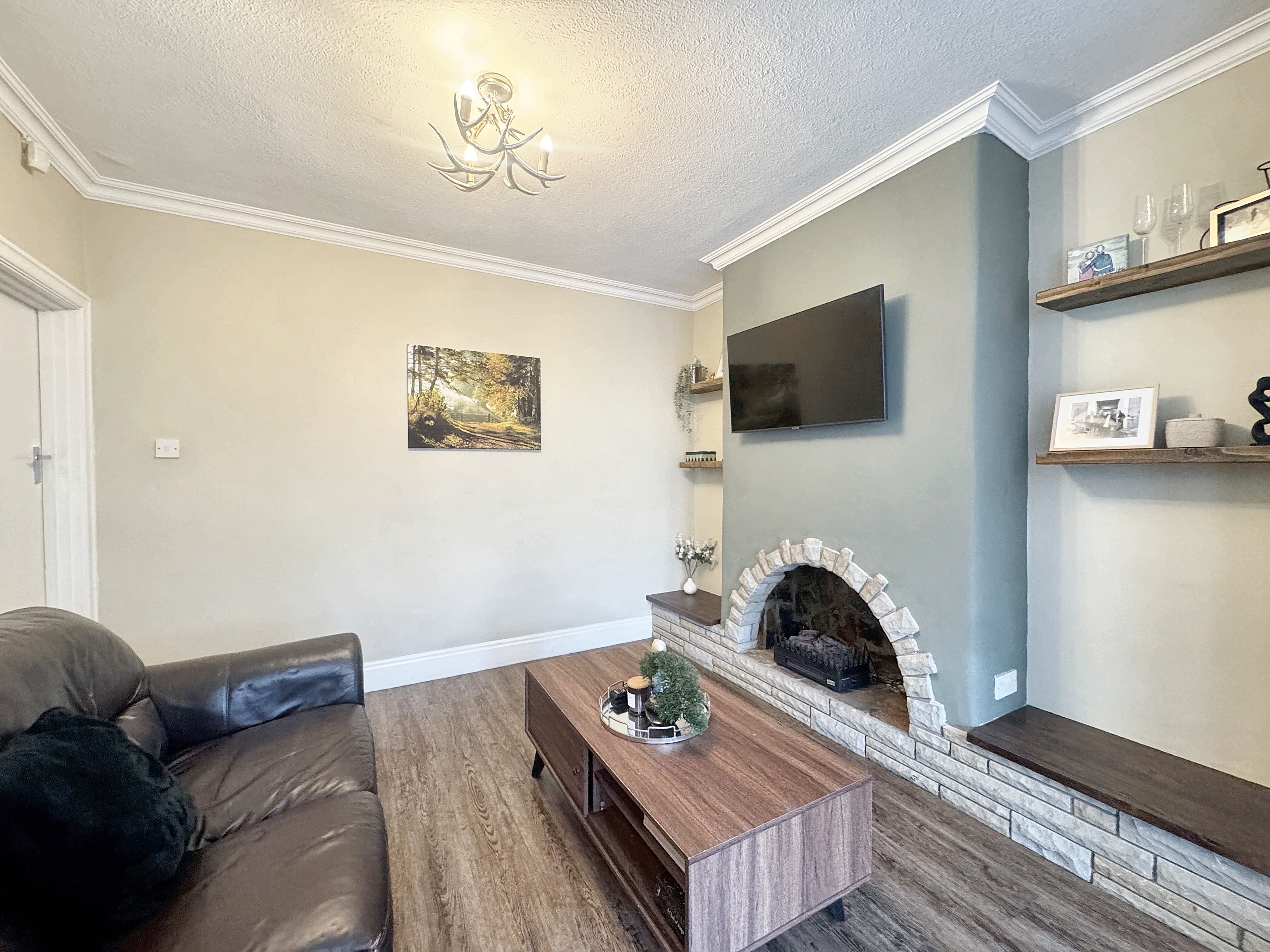 Open feature fire place with bespoke shelving to the alcoves with hidden storage. Patio doors to the rear elevation leading through to: