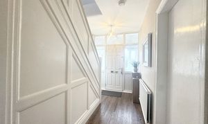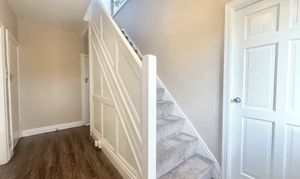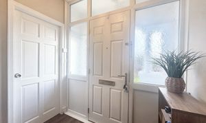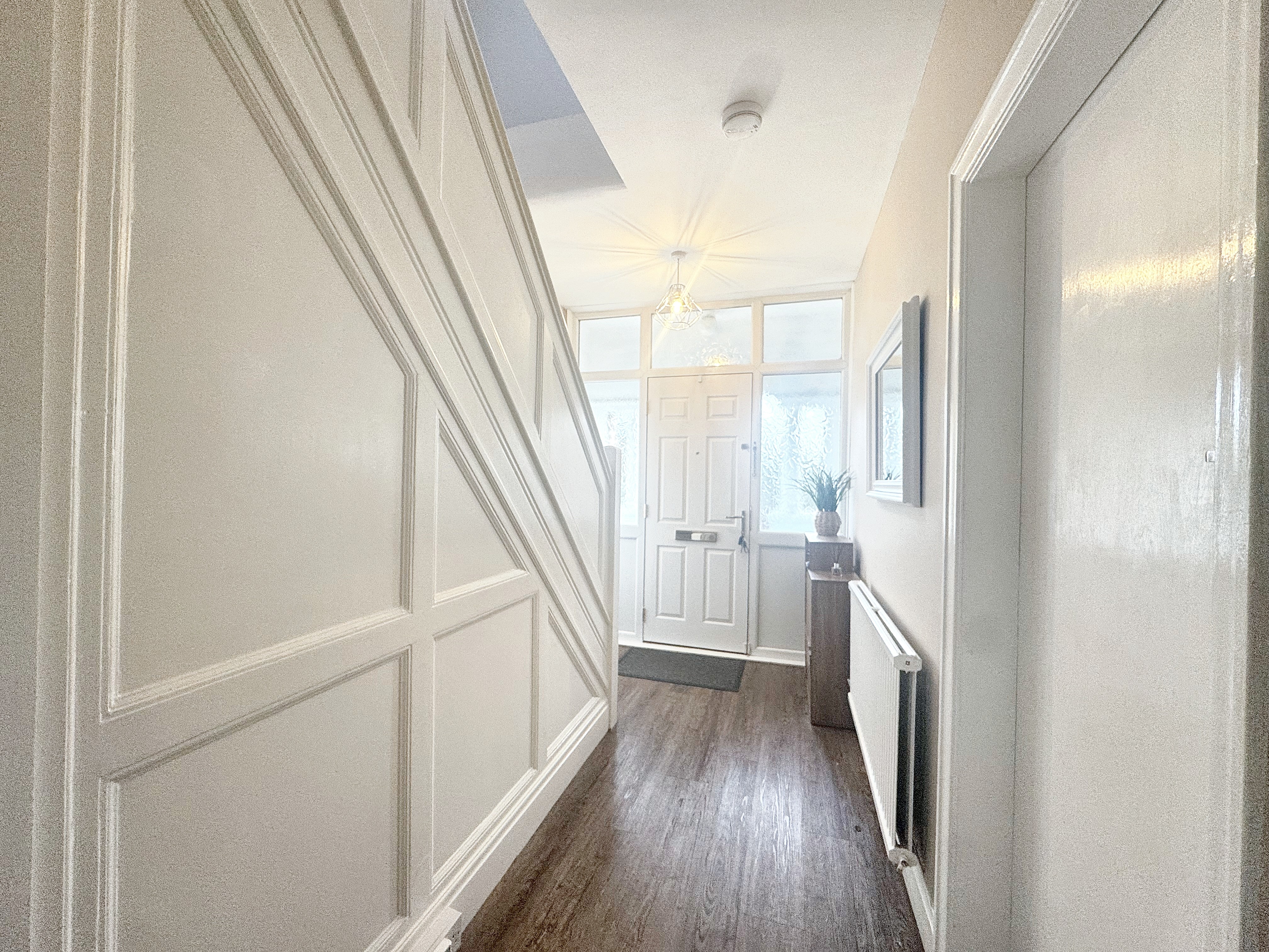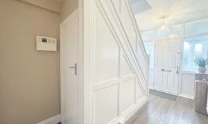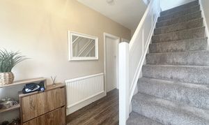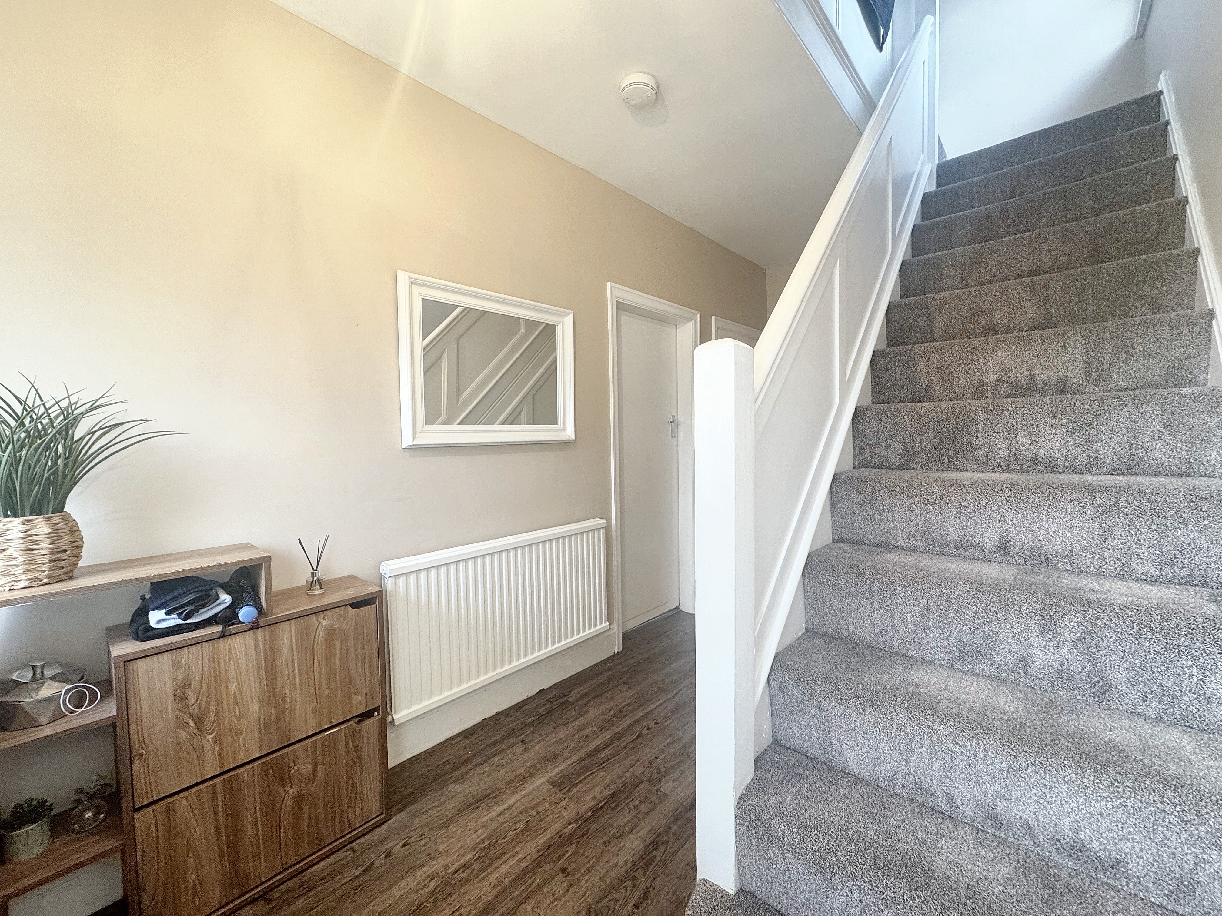 Light entrance hall with under stair storage cupboard (where the combo boiler is housed) with internal doors leading through to: