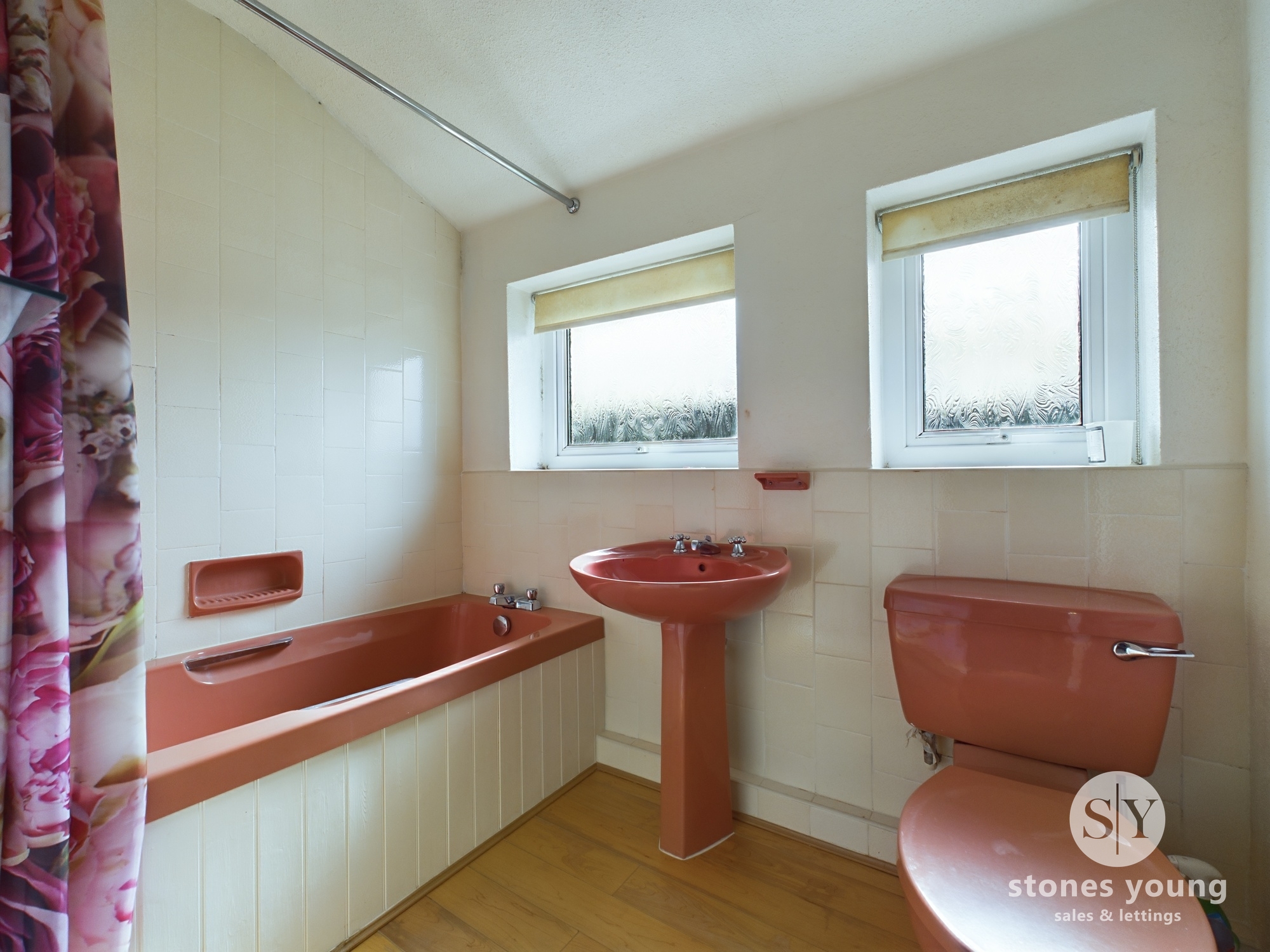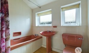 Three piece in pink, electric shower over the bath, panel radiator, laminate flooring, frosted uPVC double glazed window x 2.