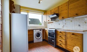Range of fitted wall and base units with contrasting work surfaces, stainless steel sink and drainer, space for electric cooker, space for washing machine, uPVC rear door to driveway, panel radiator, uPVC double glazed window.