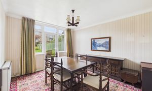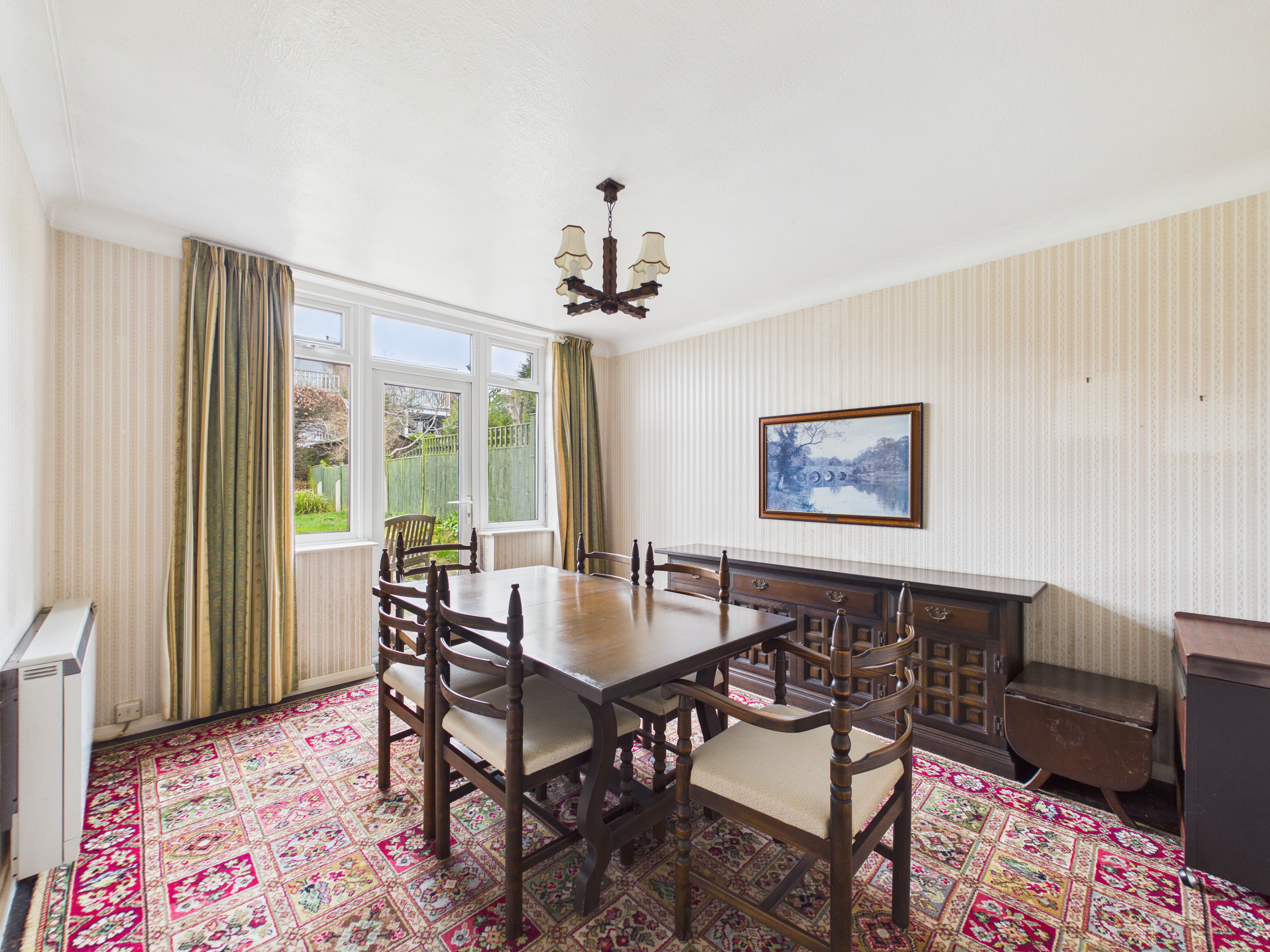 A separate spacious dining room sits to the rear of the property, offering an excellent space for gatherings and everyday meals. A glazed door flanked by side panel windows opens directly onto the rear garden, allowing natural light to fill the room while providing easy access to outdoor space.