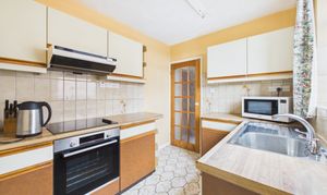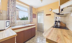 The fitted kitchen offers a range of base and wall units alongside integrated cooking appliances, providing a practical space ready for updating to suit modern tastes. From the kitchen there is access to a separate storage room with space for freestanding appliances, along with a convenient separate WC and a side door providing external access.