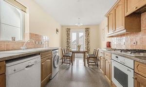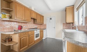 The kitchen has a range of built-in wall and base units. Inset sink with tap over, built in oven and hob with extractor above. Space for freestanding fridge, dishwasher and washing machine.
