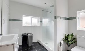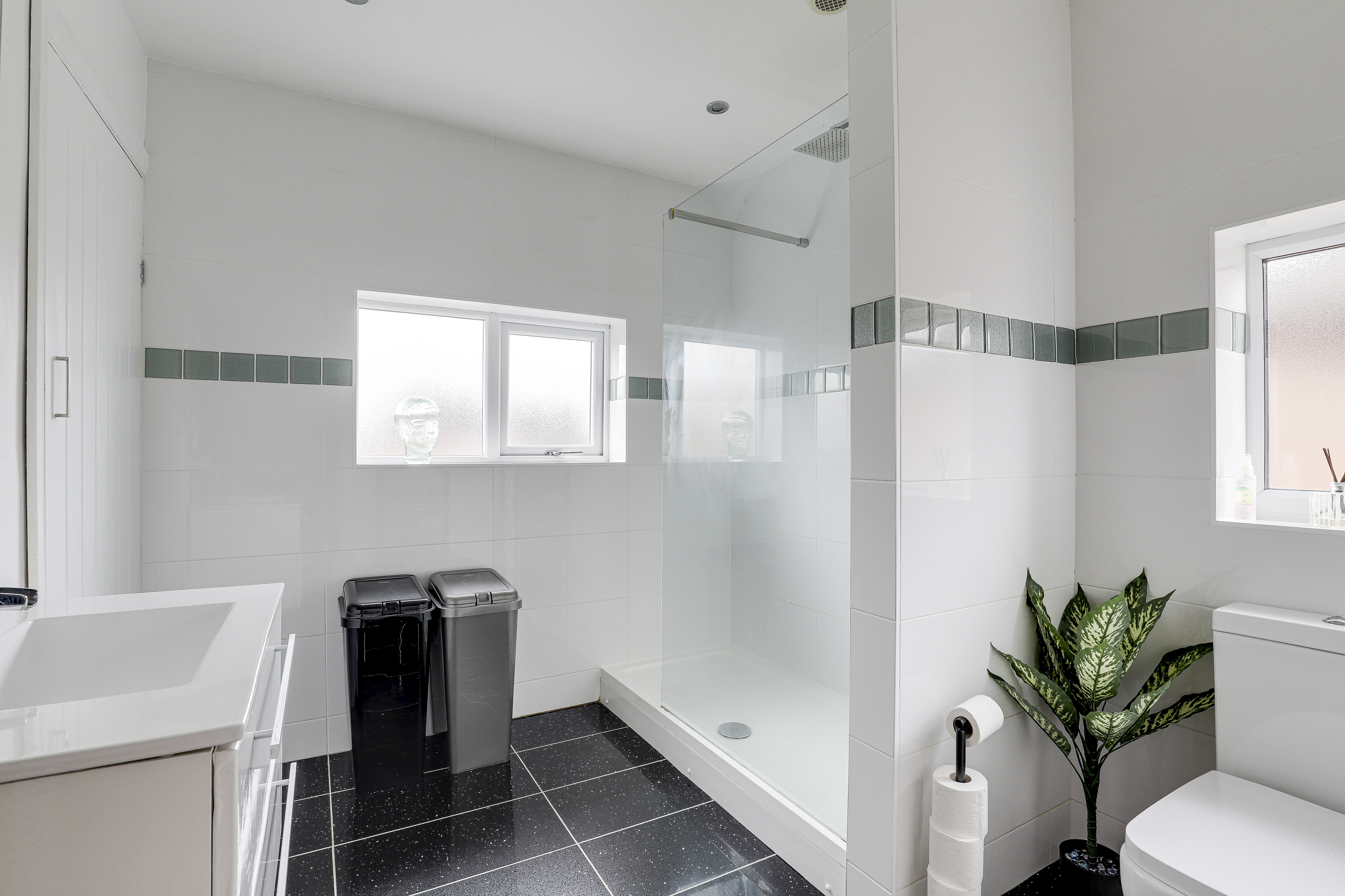 The shower room has a low level flush W/C, a wall-mounted vanity style wash basin, a fitted shower enclosure with a mains-fed over the head rainfall shower and a hand-held shower, tiled flooring, partially tiled walls, a chrome heated towel rail, recessed spotlights, an extractor fan and UPVC double-glazed obscure windows to the side and rear elevations.