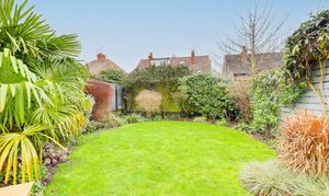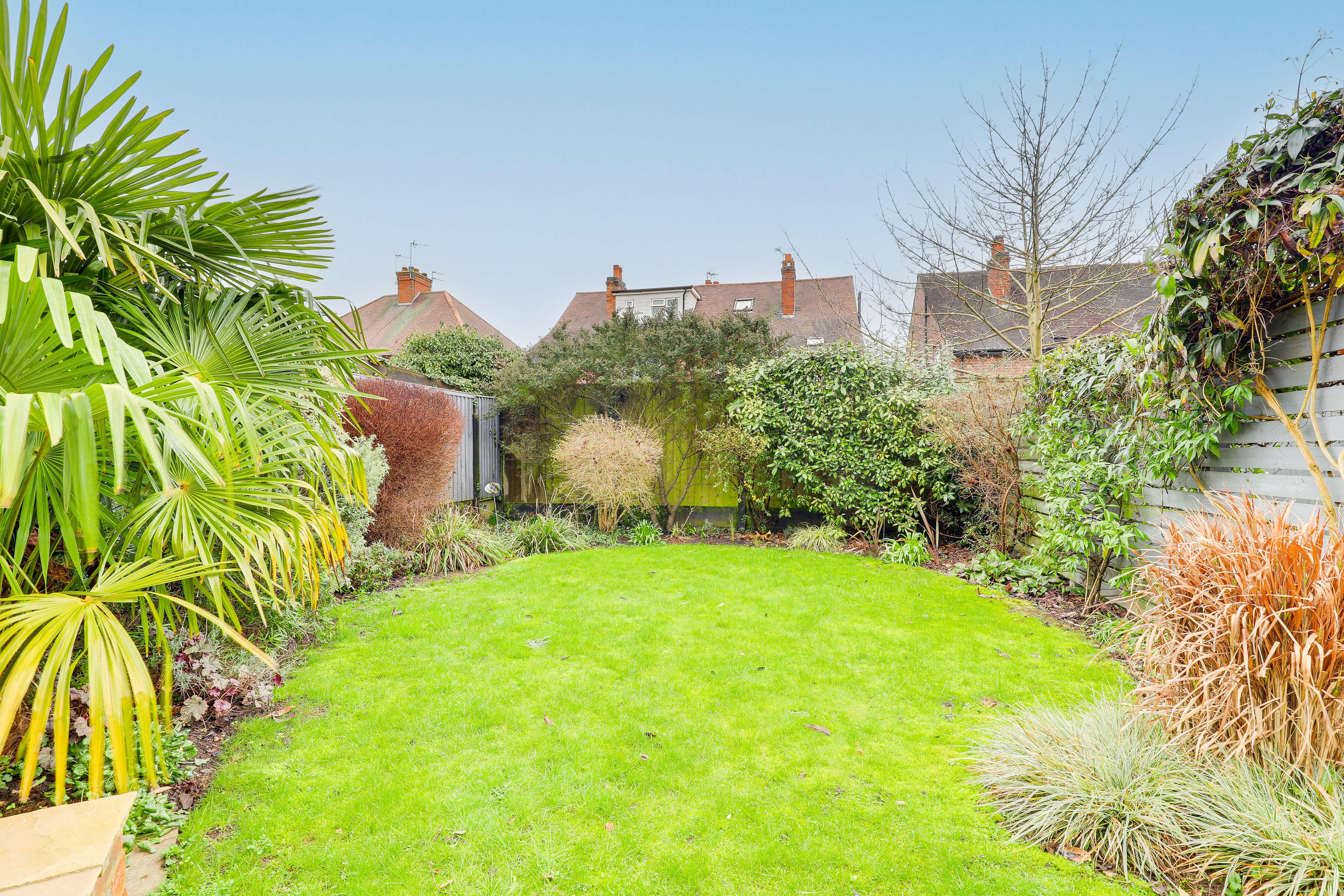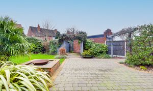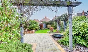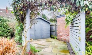To the rear is a private garden with a lawn, mature shrubs and trees, a block paved patio seating area, a pergola, a shed and fence-panelled boundaries.