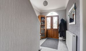 The entrance hall has a UPVC double-glazed window to the side elevation, carpeted flooring and stairs, an under the stairs cupboard, a radiator, coving and UPVC double French doors providing access into the accommodation.
