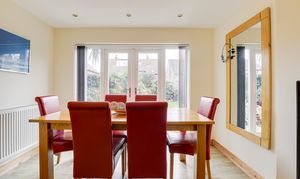 The dining area has laminate flooring, a radiator, recessed spotlights and UPVC double French doors providing access out to the garden.