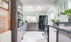The kitchen has a range of fitted gloss base and wall units with worktops, an integrated double oven, a hob with an extractor hood, a stainless steel sink and a half with a drainer and a swan neck mixer tap, space and plumbing for a washing machine and dishwasher, space for a fridge-freezer, tiled flooring, a column radiator, recessed spotlights, skylight windows, UPVC double-glazed windows to the side and rear elevations and a single UPVC door providing side access.