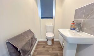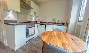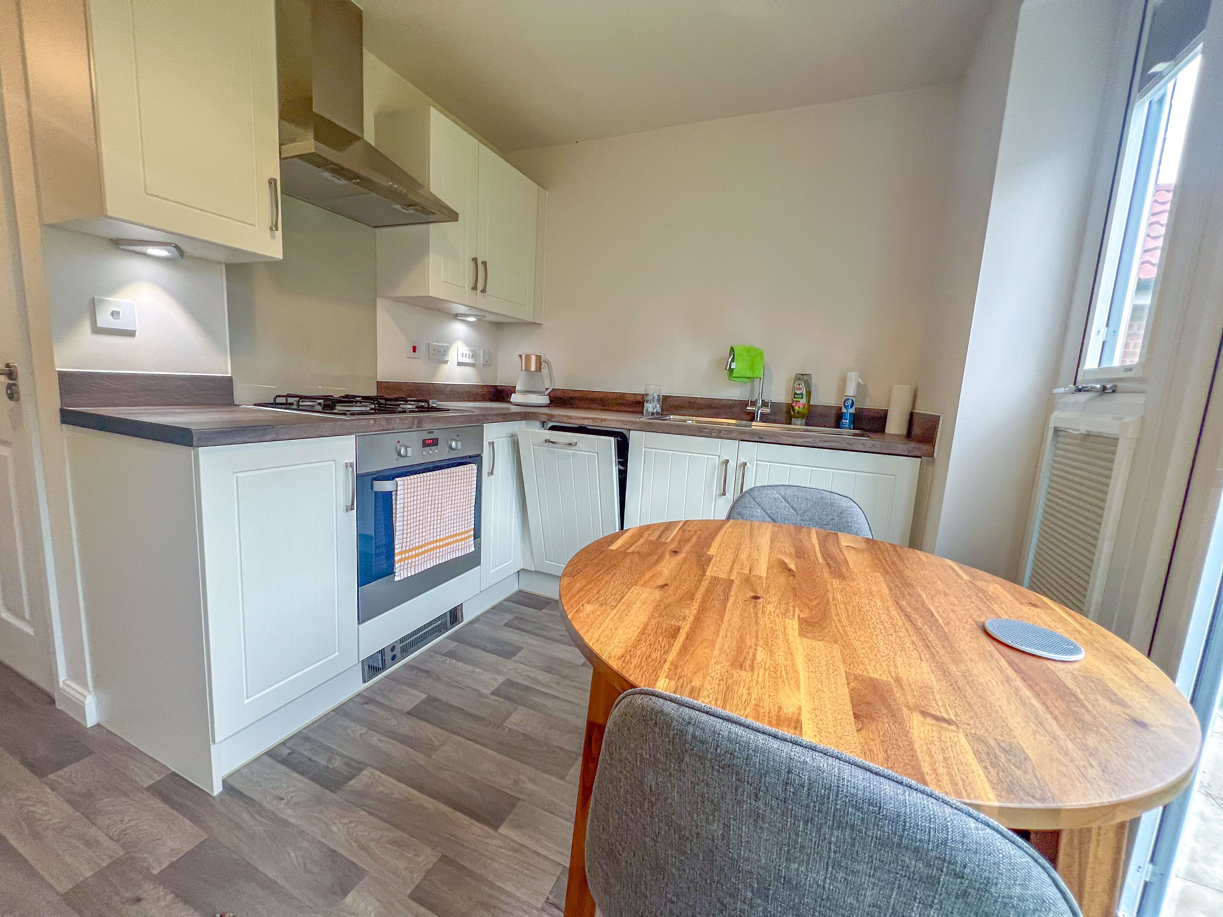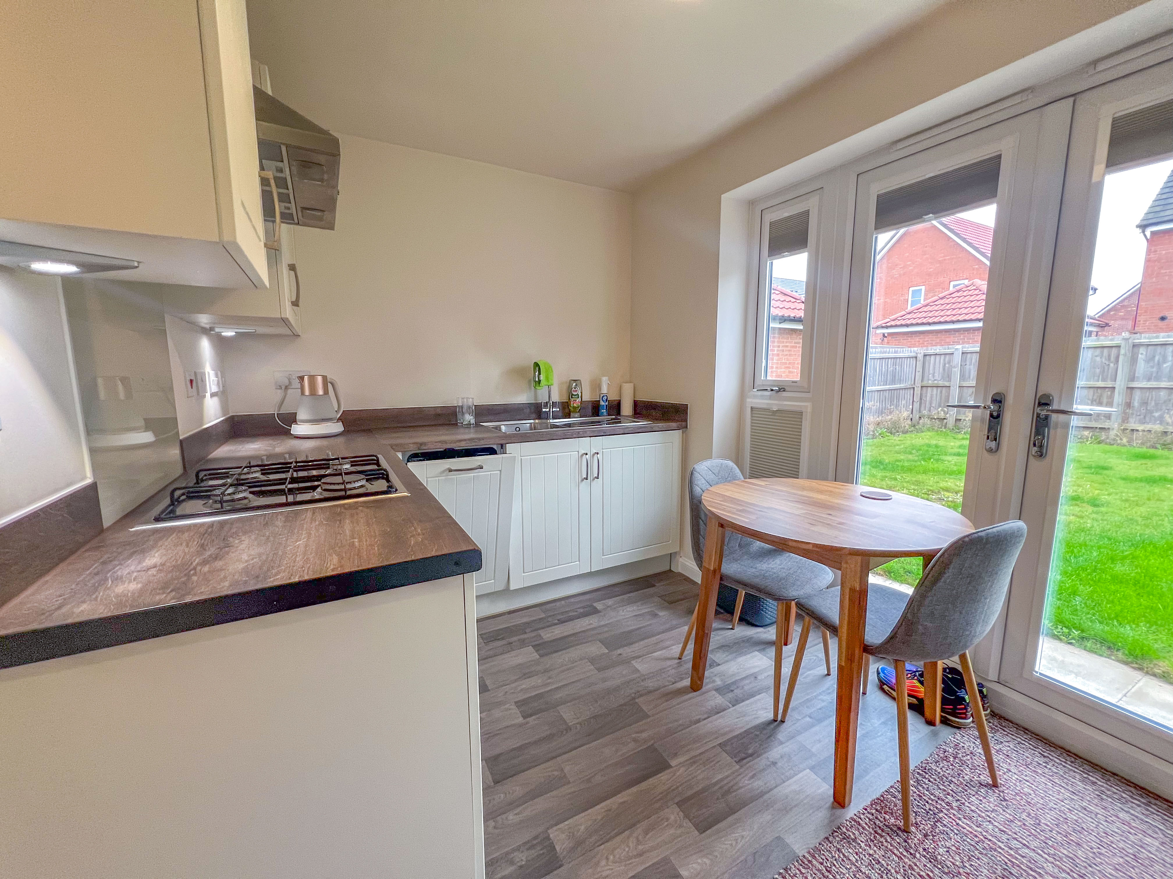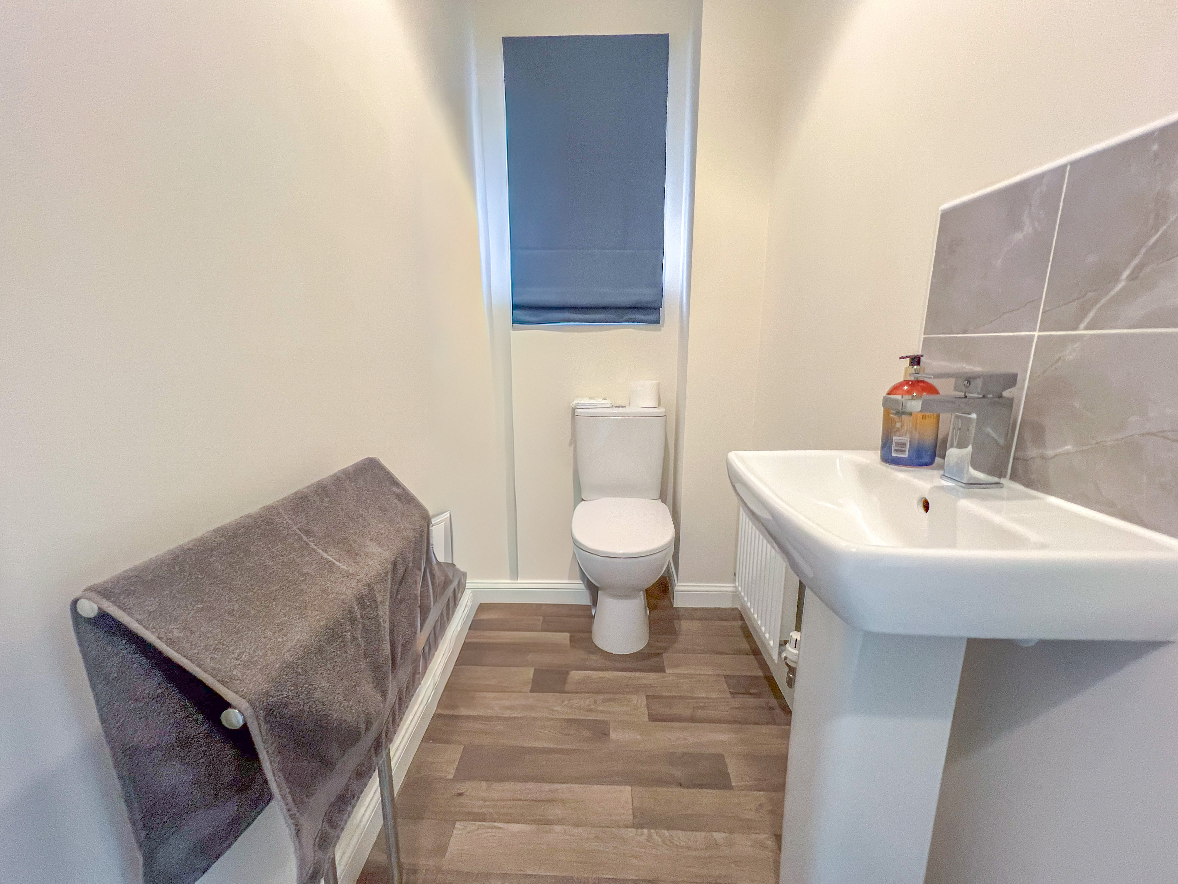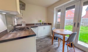 Recently constructed, this stylish home offers modern accommodation ready to move into. To the front elevation, a welcoming lounge provides a cosy retreat — an ideal space to relax and unwind at the end of the day. A convenient guest WC adds practicality, while the contemporary breakfast kitchen forms the heart of the home. Fitted with a range of sleek modern units and finished with a clean, fresh design, it also boasts French doors that open directly onto the rear garden, effortlessly blending indoor and outdoor living.