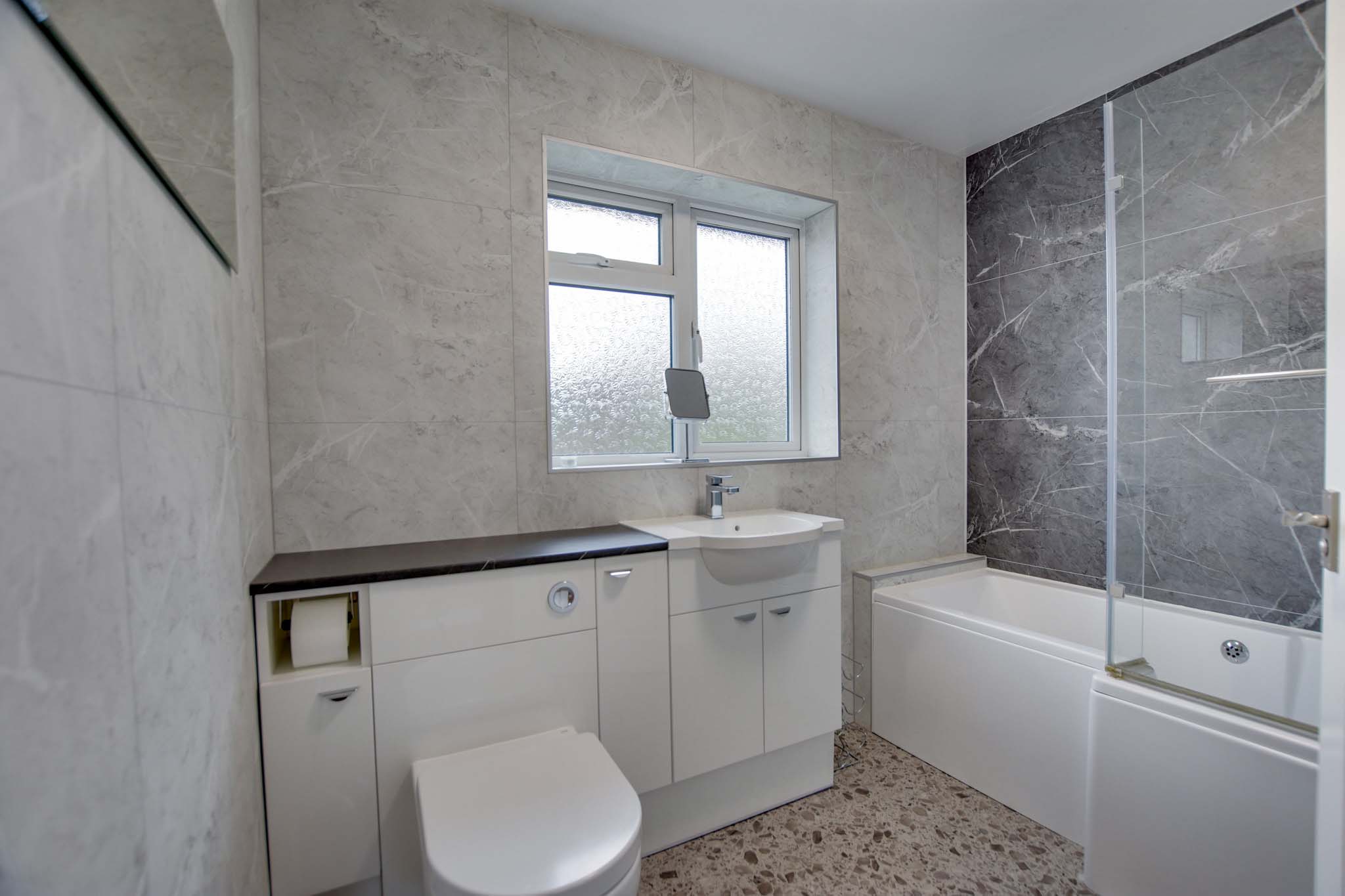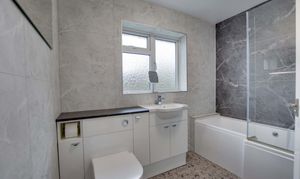 With a double-glazed window to the rear elevation, bath with shower over, low-level WC, wash hand basin, panelled walls, and a heated chrome towel rail.