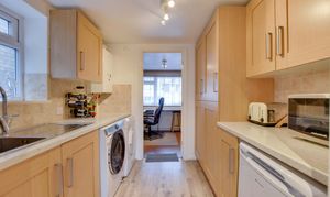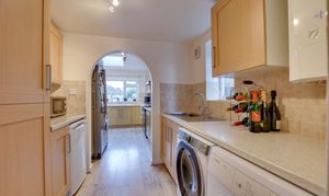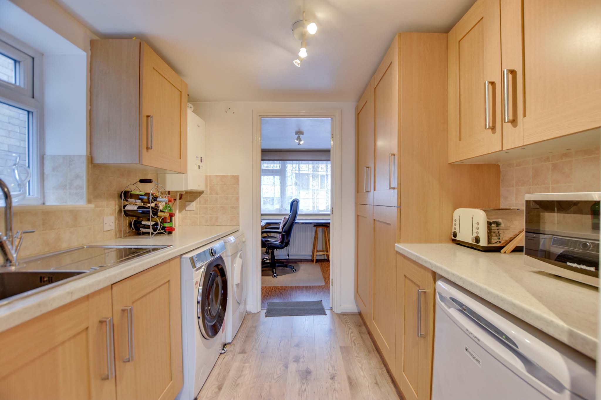 With a double-glazed window to the side elevation, stainless steel sink and drainer unit, a range of wall and base units with work surfaces over, a wall-mounted boiler, plumbing for a washing machine, space for a tumble dryer, and laminate flooring.