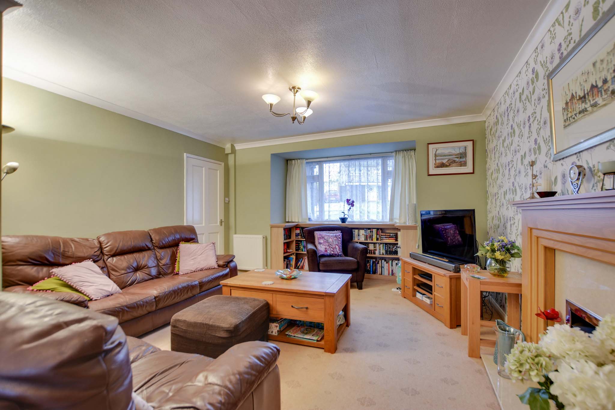 With a double-glazed bay window to the front elevation, built-in shelving, a living flame-effect gas fire with marble insert/hearth and fire surround, a TV point, display cabinets, and two radiators.