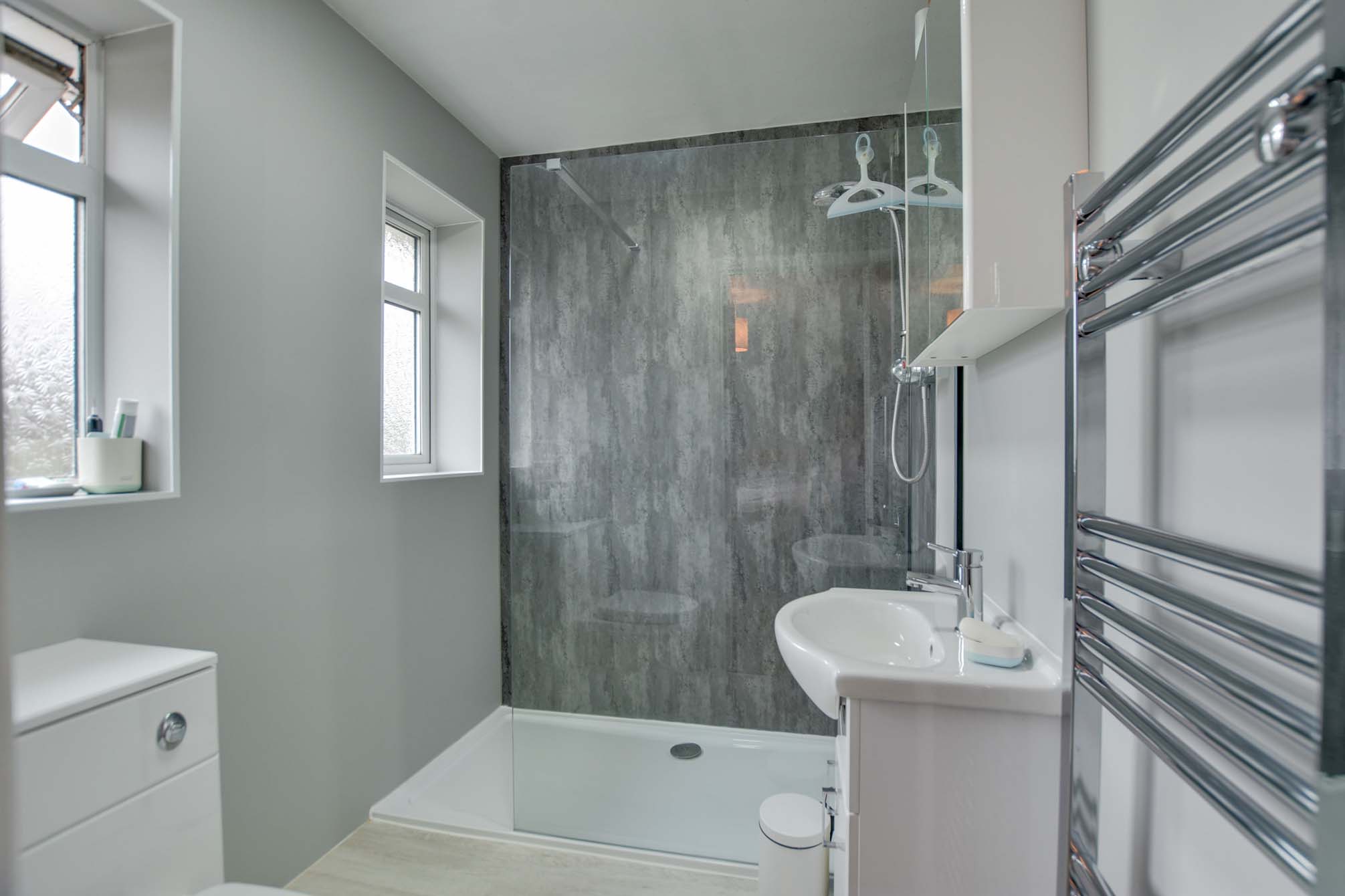With two double-glazed windows to the rear elevation, a walk-in shower cubicle, a wash hand basin, a low-level WC, laminate flooring, and a heated chrome towel rail.