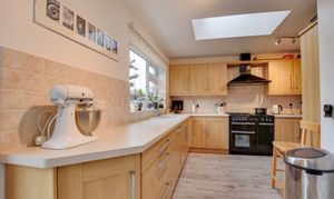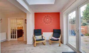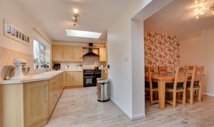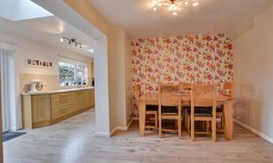 The dining area flows openly into the extended kitchen dining room, which enjoys French doors and skylight windows overlooking the rear garden. The kitchen is fitted with a range of wall and base units, work surfaces, a built-in dishwasher, sink and drainer, and a gas cooker point with chimney hood. A separate utility room provides additional storage, appliance space, and houses the wall-mounted boiler. A ground-floor office/study completes the downstairs accommodation.