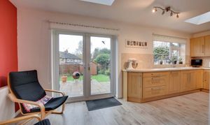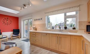 (narrowing to 2.1m) With double-glazed French doors to the rear garden, double-glazed window to rear elevation, two double-glazed skylight windows to rear elevation, gas cooker point with chimney hood over, built-in sink and drainer unit, range of wall and base units with work surfaces over, built-in dishwasher, laminate flooring, and radiator.
