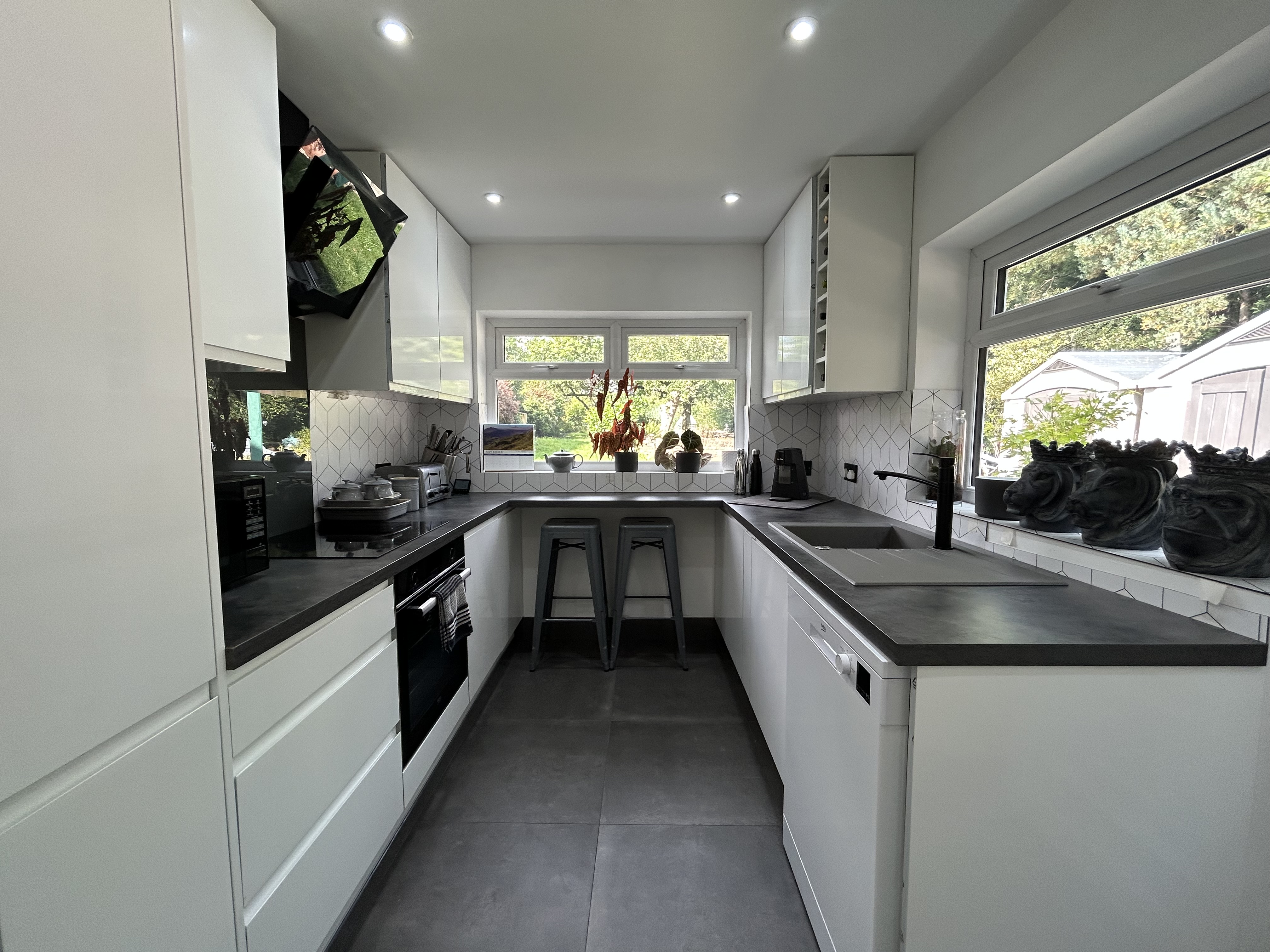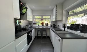 Dual aspect with a window to the side and rear elevations. Inset spotlights. Fitted with a range of modern wall and base units complete with contrasting work surfaces and integrated appliances including: oven, hob and hood.