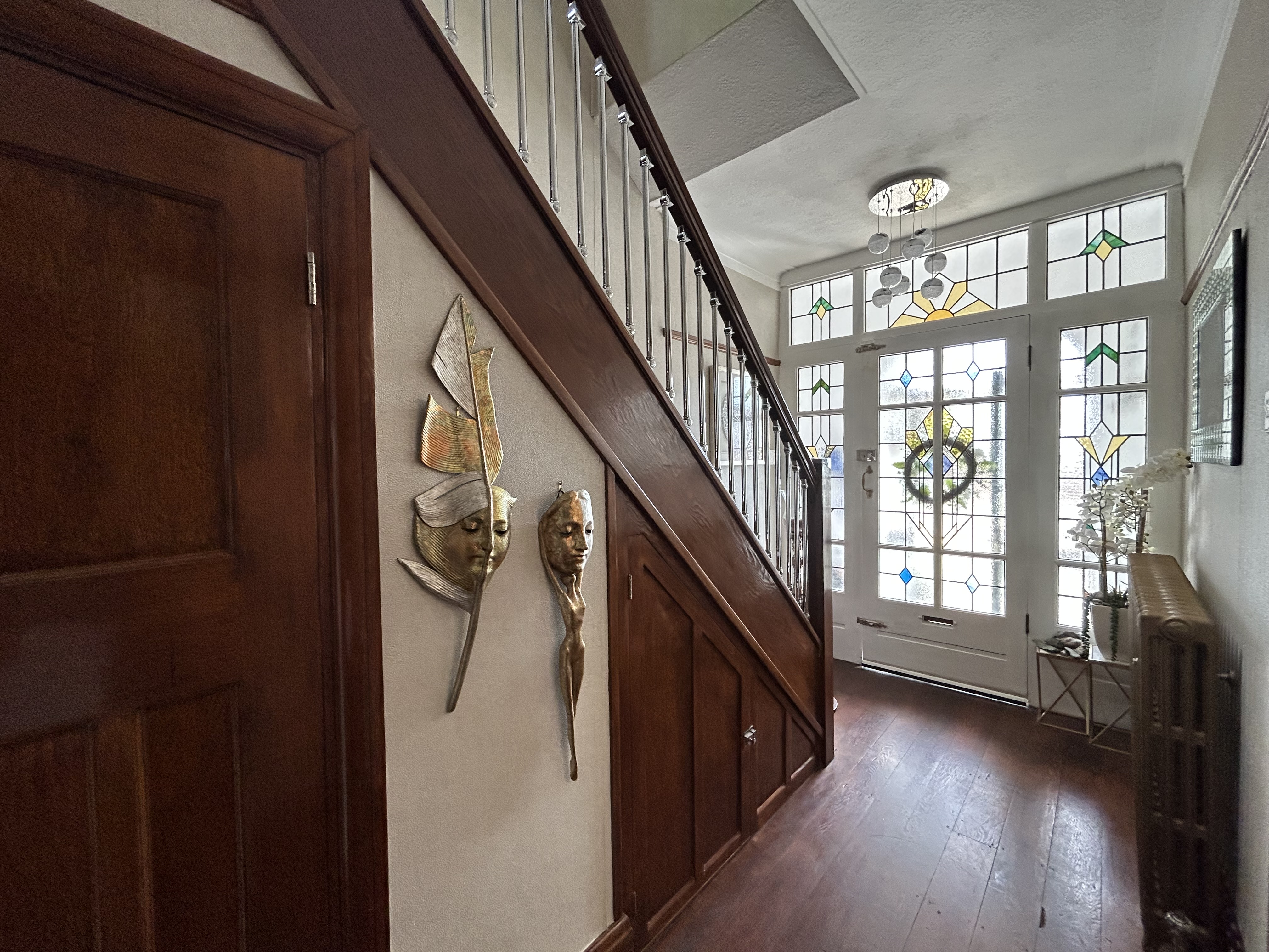 Glazed external door with a window to both sides. Stained and leaded glazed internal door with stained and leaded windows above and to both sides leads through to: