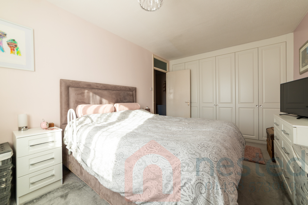 A bright and airy double bedroom with fitted wardrobes, overlooking the communal gardens, providing a peaceful outlook and a lovely sense of greenery.