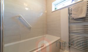 The bathroom is finished in a clean, contemporary style, featuring a modern white suite including a panelled bath with overhead shower and glass screen, vanity wash hand basin and low-level WC.