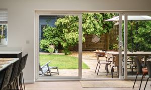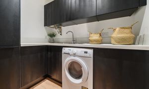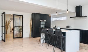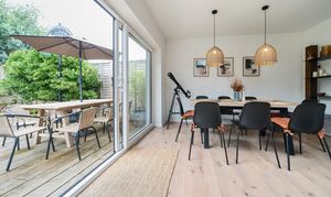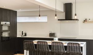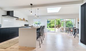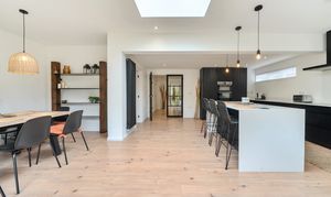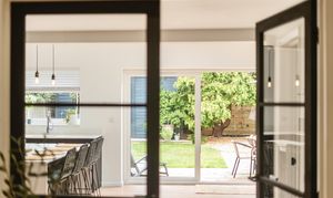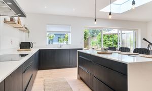 At the heart of the house is a stunning open plan kitchen, dining and living area flooded with natural light thanks to full width sliding doors and vaulted ceilings with skylights. This is a space made for modern living, where families can come together, entertain, and enjoy the seamless connection to the garden.
