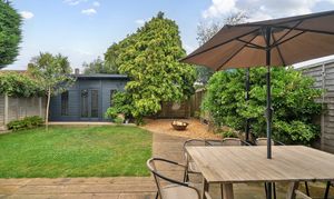 The rear garden has been thoughtfully landscaped for ease of maintenance, featuring a decked terrace, a neat lawn, and a versatile garden room, ideal for use as a home office, studio, or gym. Additional highlights include an outside shower, hot and cold taps, and stylish outdoor lighting – perfect for both day-to-day living and entertaining. To the front, the property benefits from a private driveway providing parking for two to three vehicles.