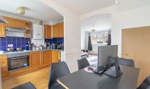 The front door opens into a spacious lounge featuring wooden flooring, a double-glazed window to the front aspect and stairs leading to the first floor. This flows through to the dining room, where the wooden flooring continues. From here, a rear door provides access to the garden and an archway leads into the kitchen.