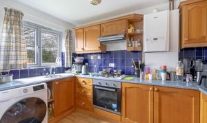 The kitchen is fitted with a range of floor- and wall-mounted units, a sink and drainer, integrated gas hob with extractor fan, and offers space and plumbing for a washing machine as well as space for a fridge/freezer. The wall-mounted gas boiler is also located here, and the wooden flooring continues throughout.