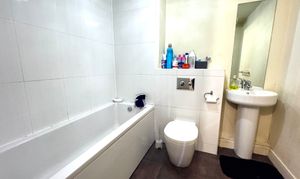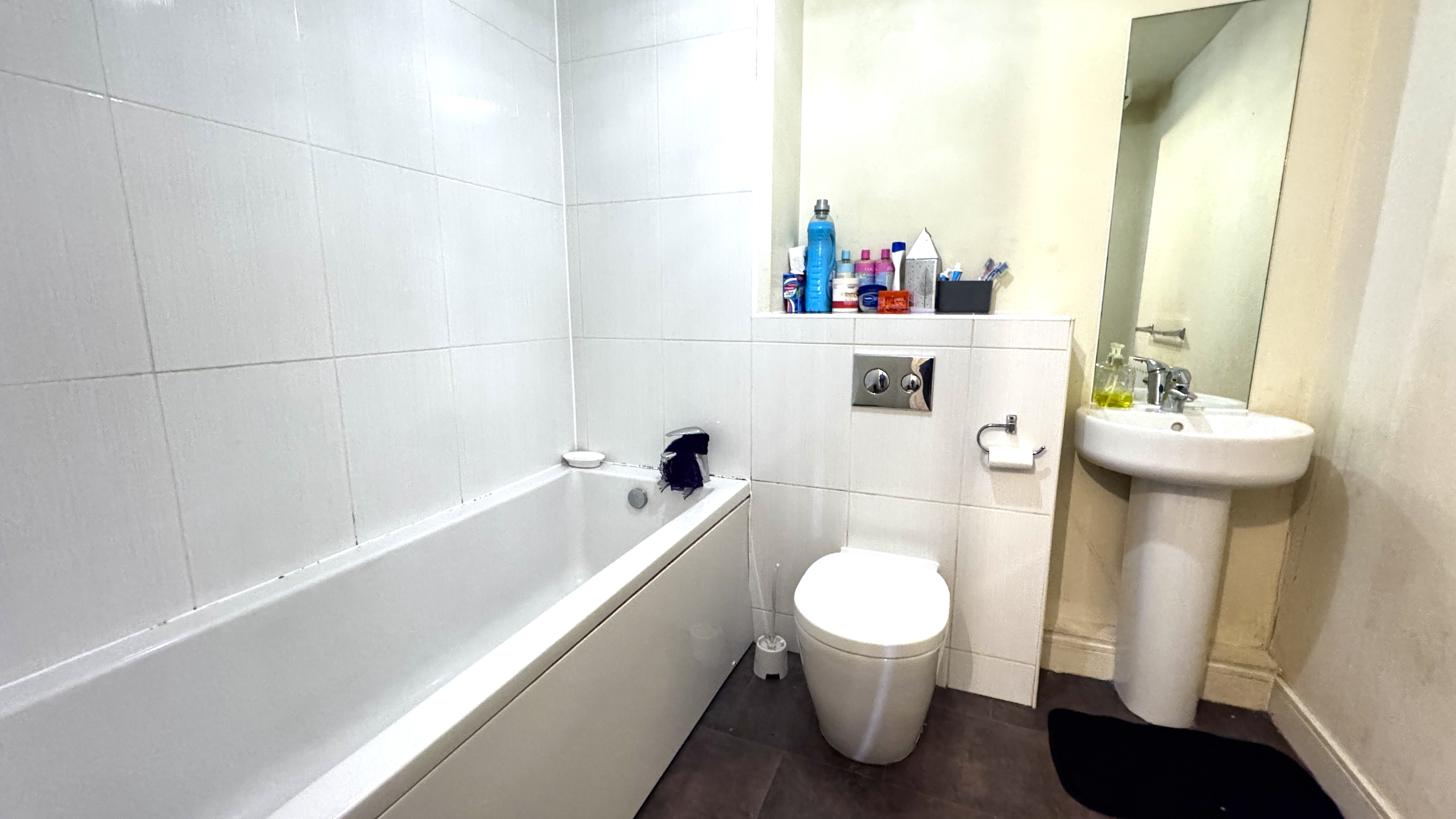 The second bedroom is equally well-sized, making it perfect for use as a guest room, office, or additional bedroom depending on your needs. The family bathroom, located just off the hallway, offers a relaxing space to unwind, featuring a full-size bath, low-level WC, and wash hand basin.