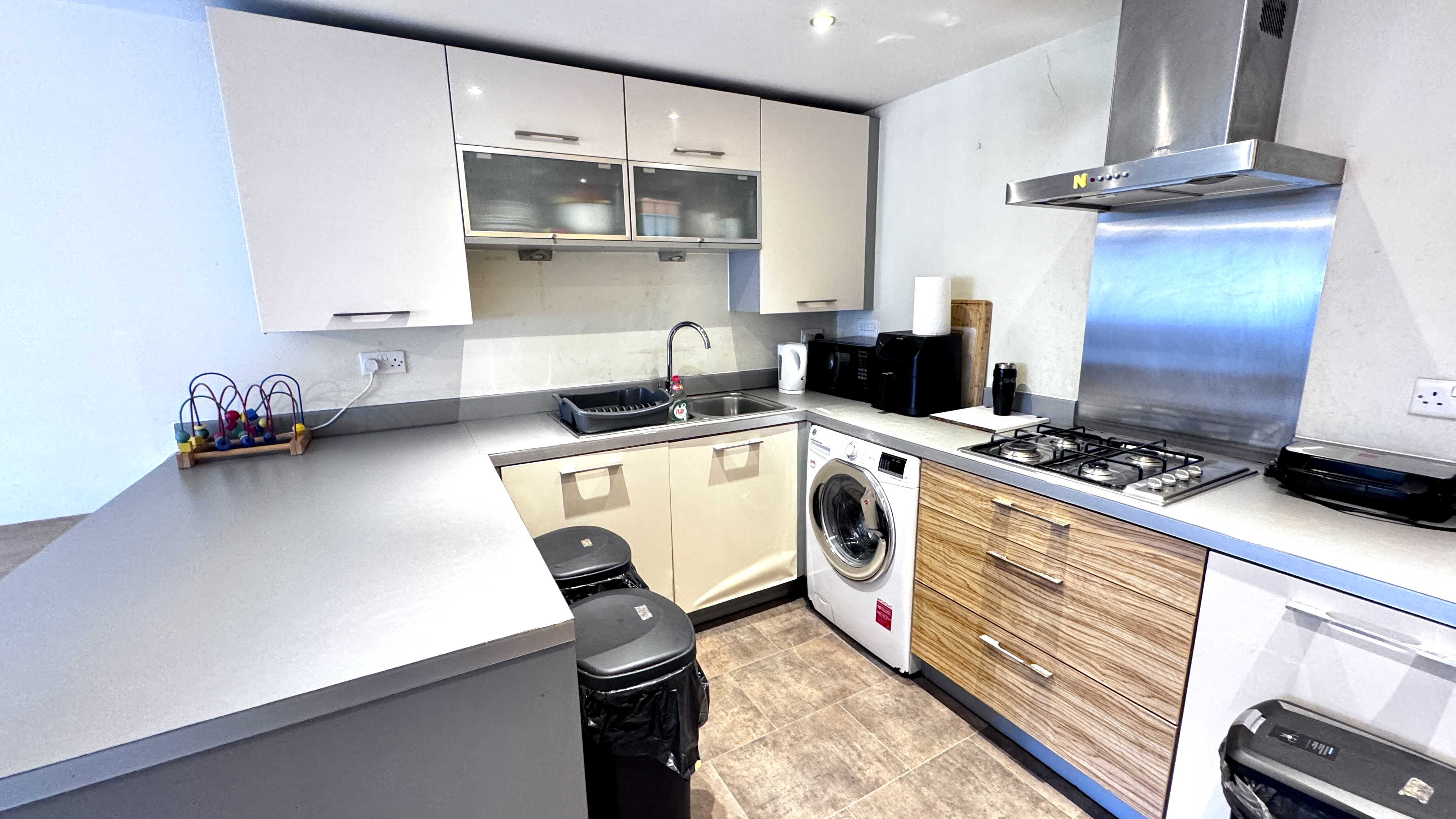 Upon entering, you'll find a spacious open-plan kitchen and living area that creates a light, airy atmosphere, ideal for both relaxation and entertaining. The kitchen has space and plumbing for a washing machine and equipped with good-quality appliances including a fridge/freezer, oven, stainless steel one-and-a-half bowl sink and drainer, a gas hob, and an extractor fan. These features ensure a fully functional, contemporary space for preparing meals and doing laundry, all within easy reach of the living room.