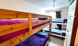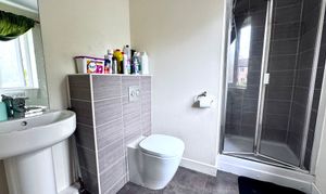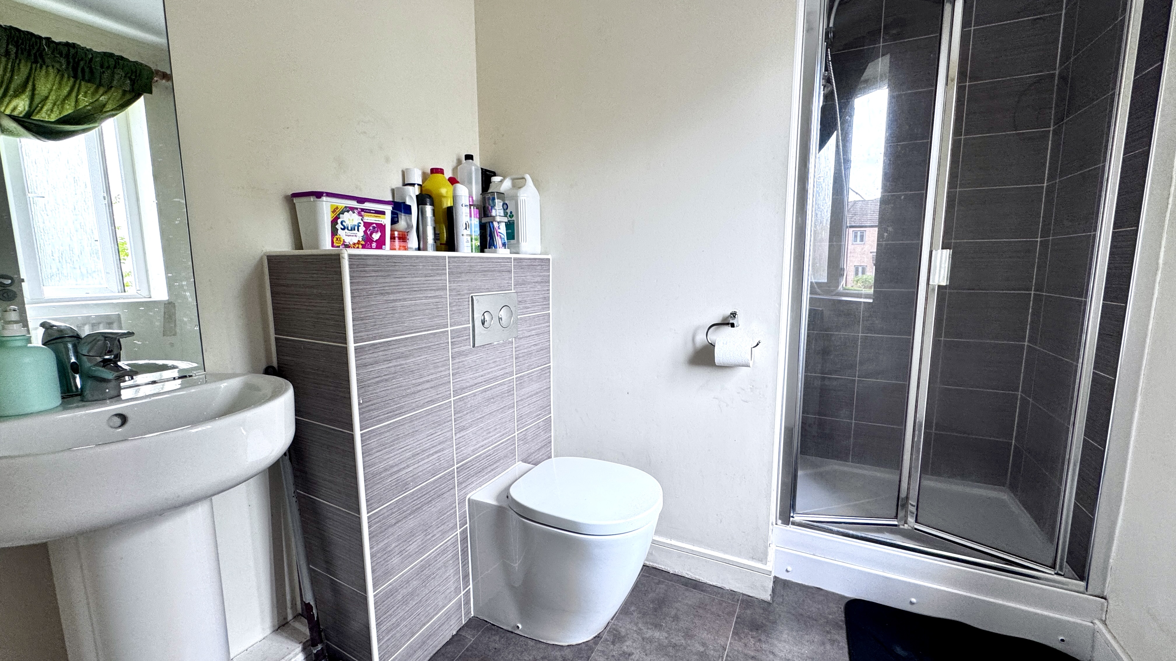 Bedroom one is a generously-sized room, featuring dual aspect windows that allow natural light to flood the space, enhancing its sense of openness. The room also benefits from an en-suite shower room, providing added convenience and privacy. The en-suite includes a shower cubicle, low-level WC, and a wash hand basin, offering everything you need for a quick refresh or an evening wind-down.