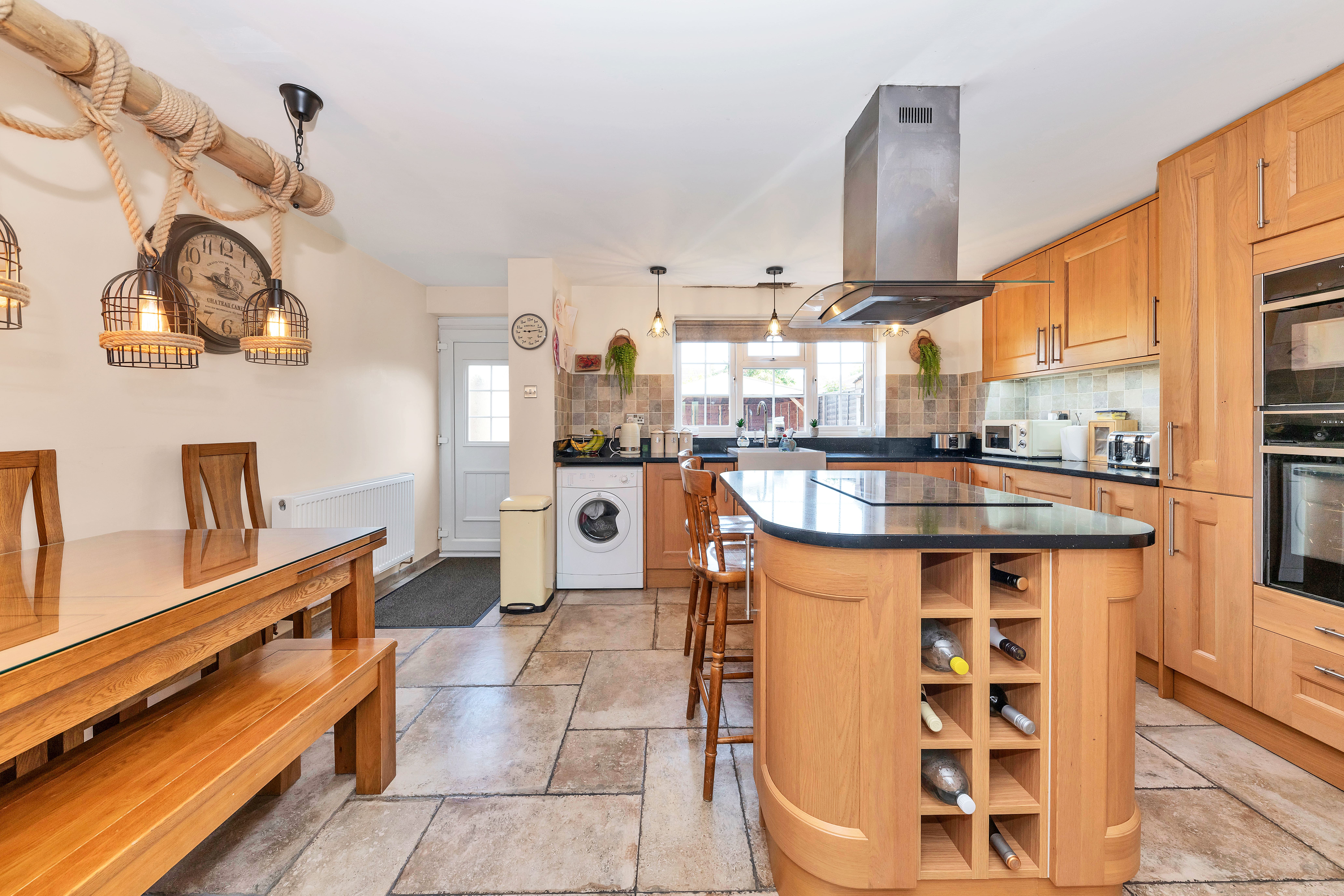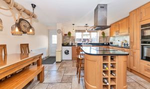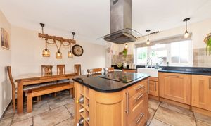 The kitchen/breakfast/dining room is wonderfully open-plan, enjoying a window and door to the garden, a wide range of modern base and wall units, granite worktops, a large island and breakfast bar, a butler sink, tiled flooring and splashbacks, pendant lighting, an integrated hob, extractor hood, ovens, fridge/freezer and dishwasher, and space for a washing machine, large dining setting and other small kitchen appliances.