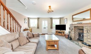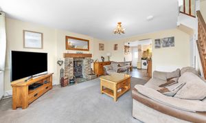 This beautifully presented cottage enjoys an attractive and tidy frontage with front borders of decorative stones and room for potted plants. Upon stepping inside, the lounge is an excellent size, with windows to a front aspect, a pretty fireplace with a wood-burning stove and exposed brickwork, carpets, pendant lighting, stairs to the first floor, integrated storage, and ample space for a wide variety of lounge and storage furniture.
