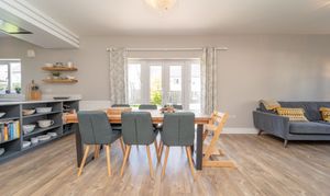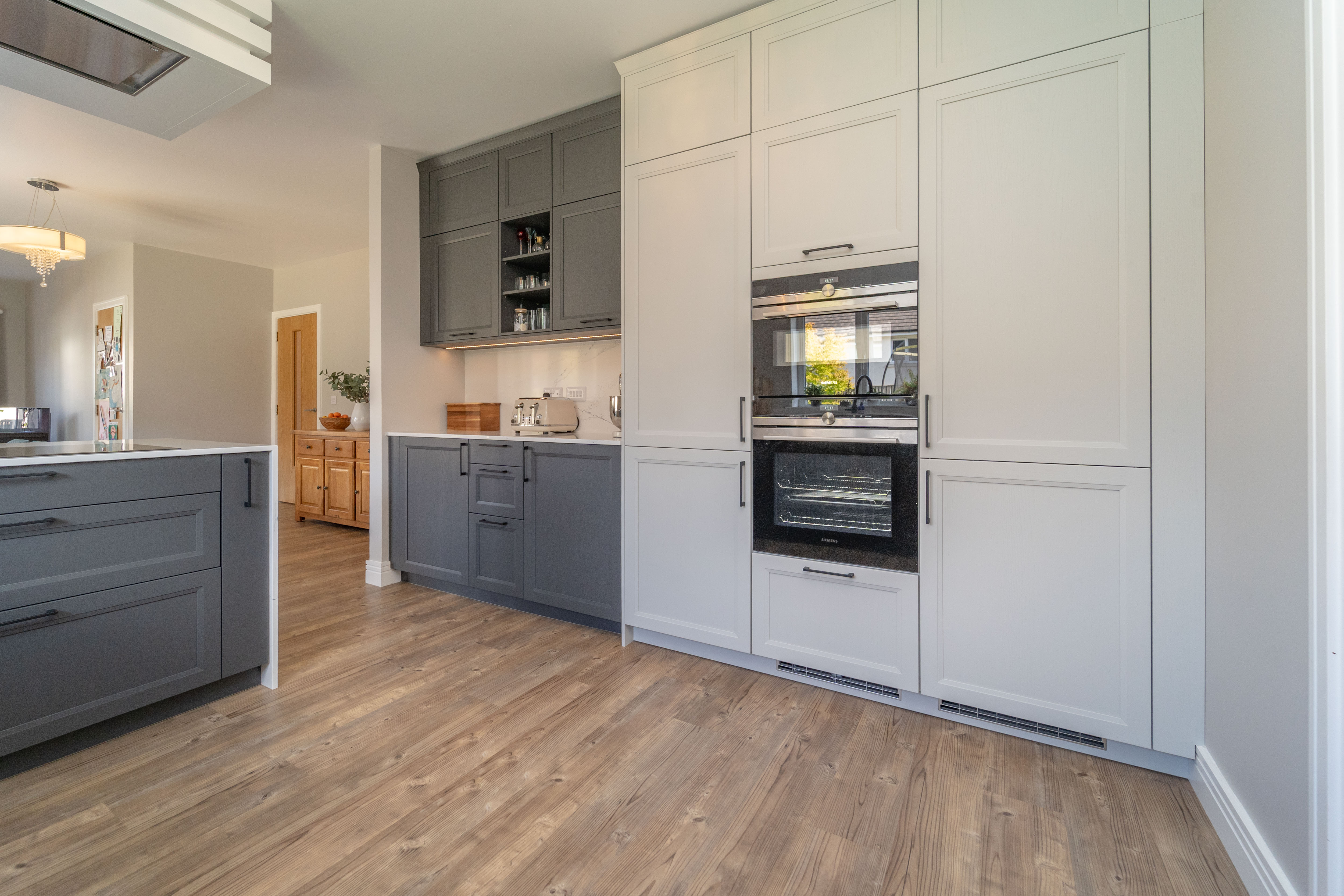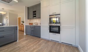 This superb open plan room combines contemporary style with practical design, centred around a luxury kitchen fitted with wall and floor units in a sophisticated blend of dark grey and dove grey, paired with sleek white work surfaces and splashback. The space is finished with neutral painted walls and continued Amtico flooring. The kitchen has built in appliances, including an eye level oven and microwave, an induction hob, an integrated stainless steel extractor hood, a tall fridge, under counter freezer, and a dishwasher – all included in the sale. An mounted sink with worktop drainer grooves and a Quooker mixer tap adds both elegance and convenience. Natural light fills the room through rear and side windows, and French doors. The generous layout easily accommodates a dining area alongside lounge space. Additional features include three ceiling lights, under unit lighting, an extractor fan, smoke and heat detectors, two radiators, power points, and a built in storage cupboard.