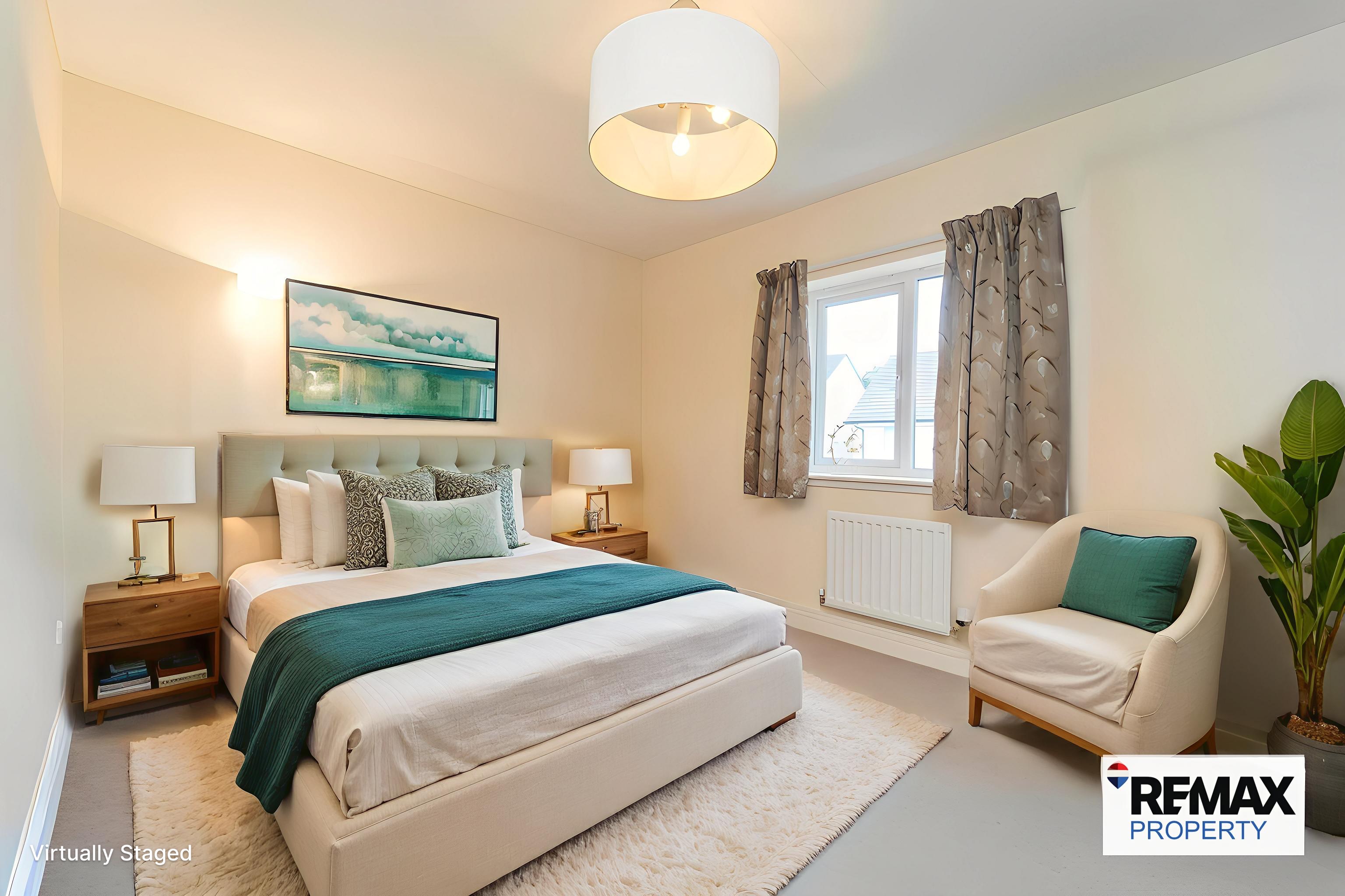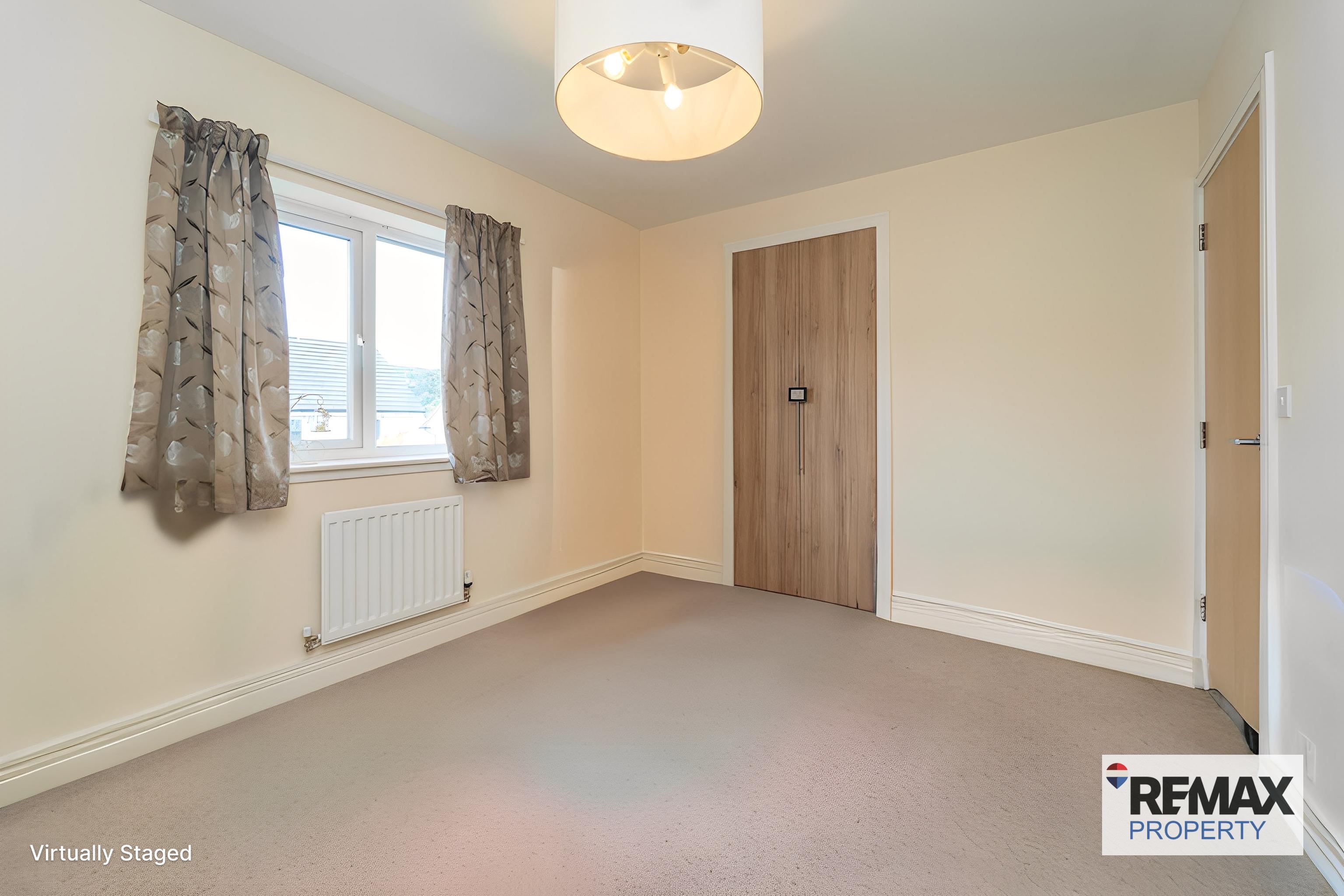 This lovely room has been finished with magnolia painted walls and carpet to the floor. Side and rear facing windows flood the space with natural light, complemented by a ceiling light. A built in wardrobe offers practical storage, while a radiator and power points complete the room.