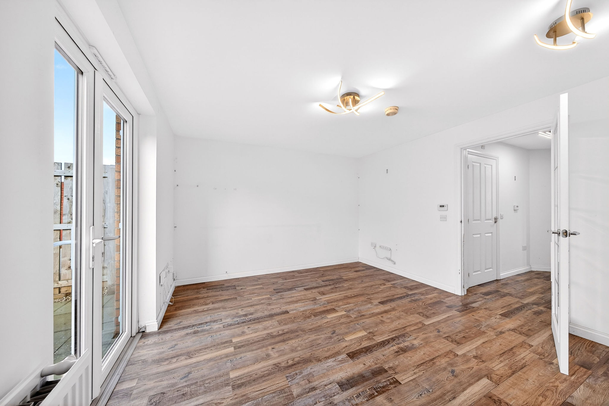 The ground floor comprises an entrance hallway with WC and storage, a bright lounge/diner with French doors to the rear garden, and a fitted kitchen with integrated appliances.