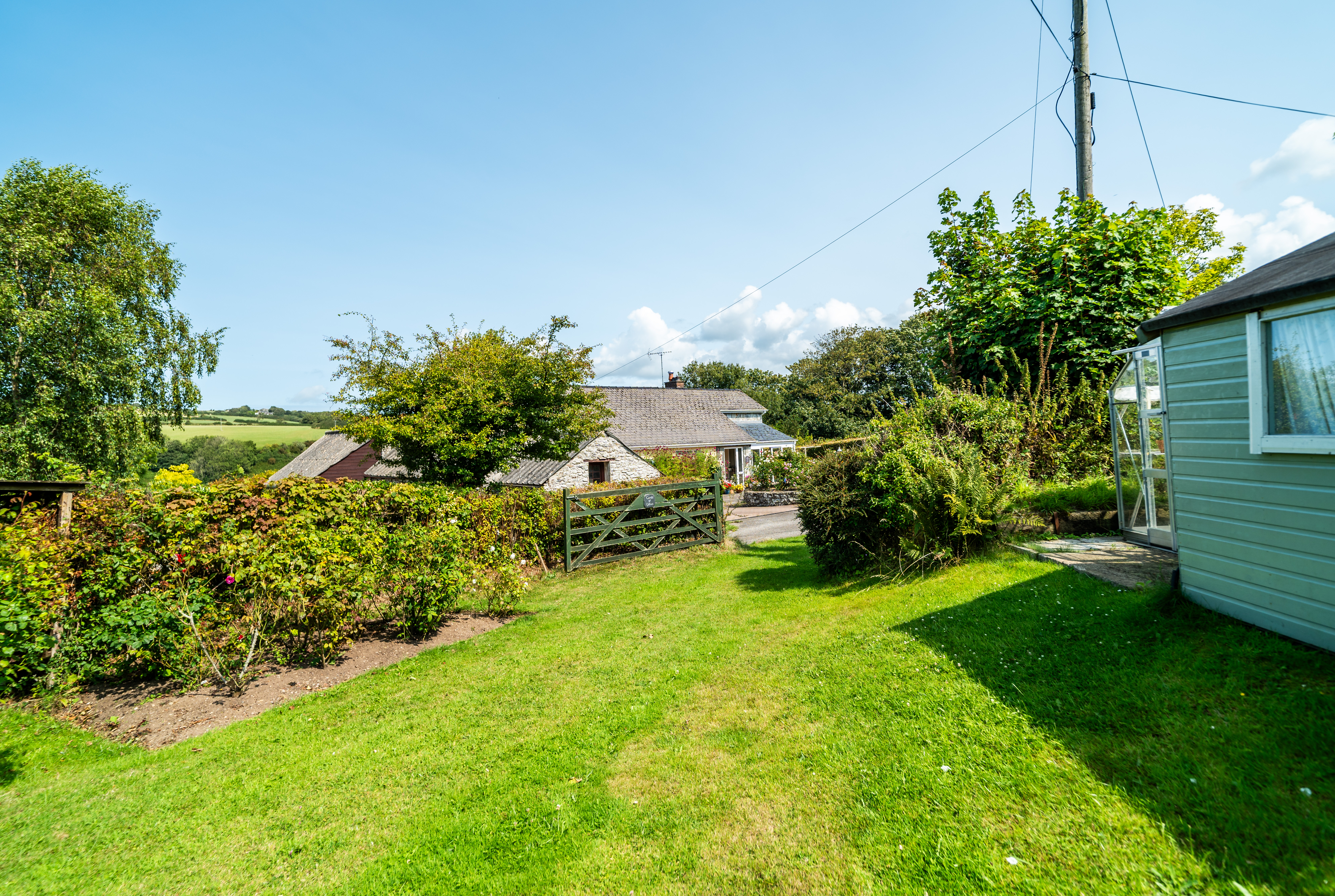The Garden at Moylegrove – An Idyllic Two-Acre Paradise Located directly across the quiet country lane from the main residence. Set within approximately two acres, this exceptional garden is a rare offering—an oasis of calm and colour with beautifully curated zones for relaxation, productivity, and nature appreciation. Approached via a discreet entrance, the grounds unfold into a series of wonderfully tended spaces. A charming timber-clad summerhouse sits to one side, perfect for peaceful afternoons with a book or an inspiring spot to work from home. Beside it, a traditional glass greenhouse stands ready for potting or propagating. There is also a detached garage ideal for secure storage or further workshop potential. The grounds are laced with formal lawns, mature trees, and expertly shaped borders bursting with seasonal colour and botanical interest. Visible plants include hydrangeas, roses, marigolds, rhododendrons, Japanese anemones, ferns, eucalyptus, ornamental grasses, wildflowers, and bay laurel—providing both vibrant blooms and year-round texture. A highlight is the wildlife pond, fringed with irises, water lilies, and native greenery, forming a perfect habitat for frogs, dragonflies, and birds. Meandering paths lead past flowering beds, a wild orchard zone, and into dappled woodland edges—ideal for quiet contemplation or children’s adventures. From various vantage points throughout the garden, there are far-reaching views of the surrounding countryside, and on clear days, you can enjoy distant glimpses of the sea—a rare and poetic addition to this already captivating space.
