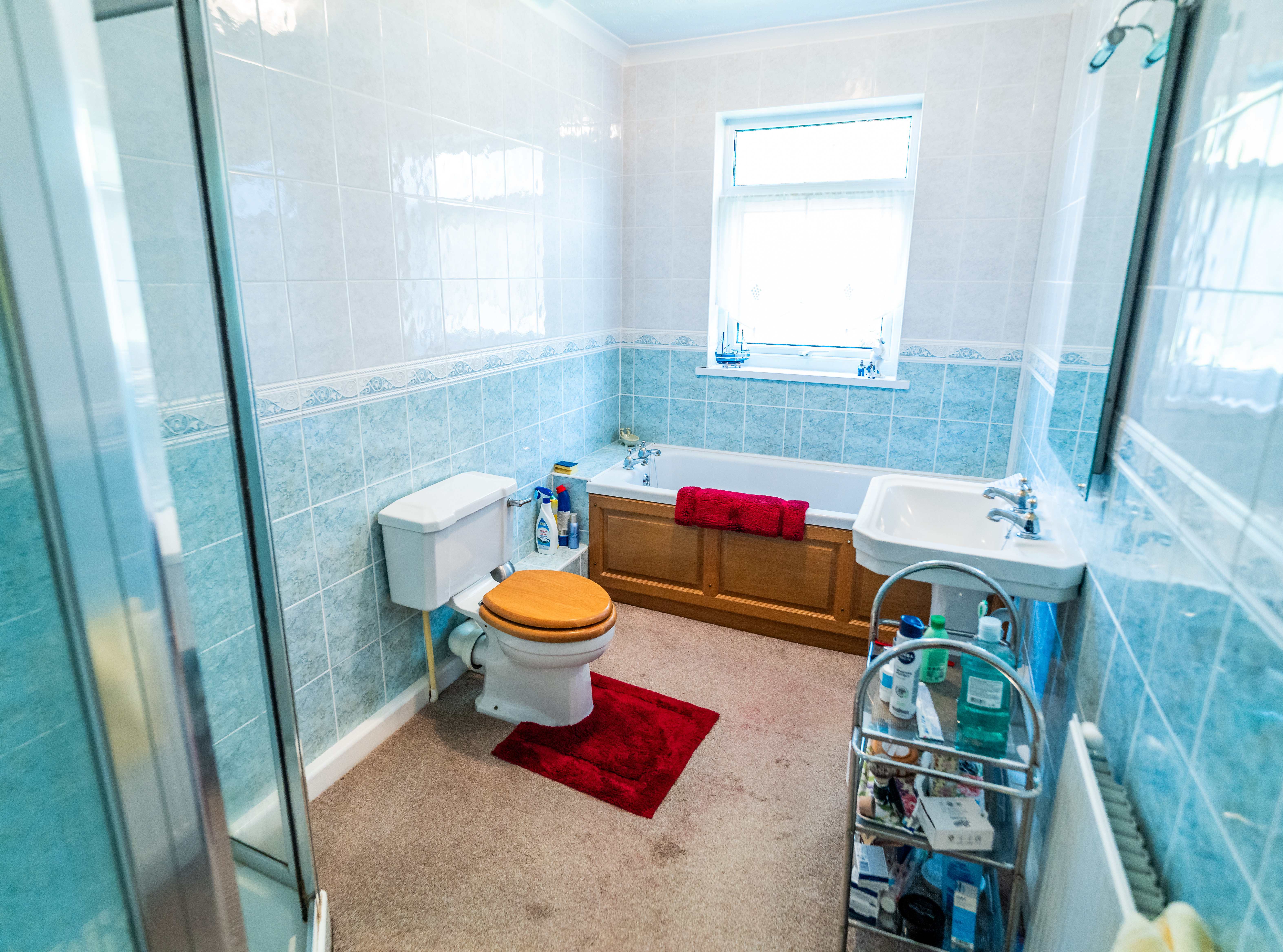 A well-proportioned four-piece family bathroom comprising a double built-in shower enclosure, a panelled bath with tiled surround, pedestal wash hand basin, and low-level WC. Finished in a soft blue and white palette with part-tiled walls and an opaque UPVC double-glazed window, the space is bright and functional. Additional features include a wall-mounted radiator and fitted carpet underfoot, providing warmth and comfort.