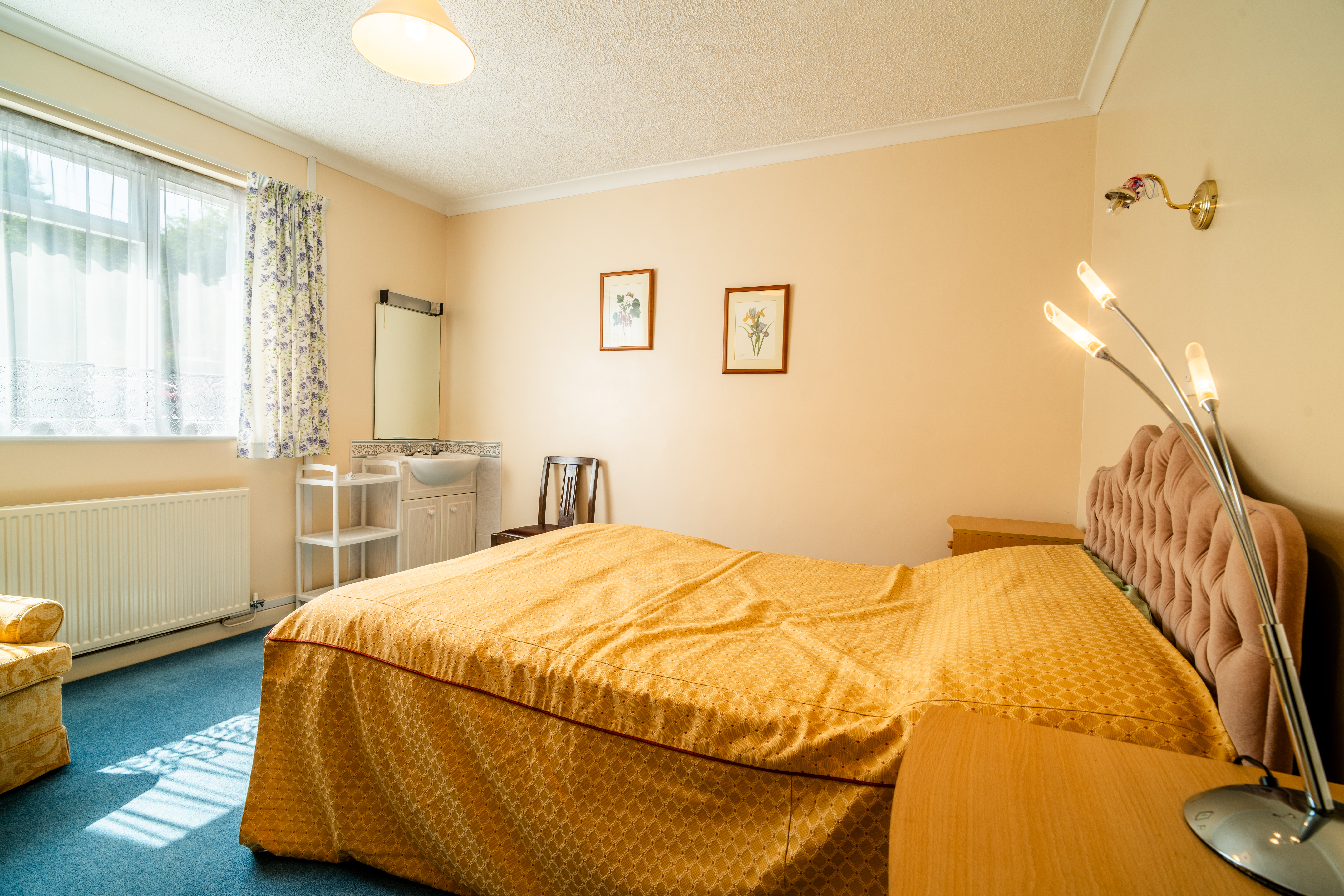 A generous front-aspect double bedroom featuring a large window overlooking the garden, this room is light and welcoming. It includes a central heating radiator, a coved ceiling for a touch of architectural detail, and a built-in vanity sink unit with tiled splashback – ideal for added convenience and functionality without compromising space.