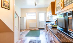 A spacious, rear-aspect kitchen enjoying lovely garden views, this is a well-appointed and practical space designed for family life. It features a range of eye-level and base units in a traditional style, complemented by part-tiled walls and easy-care cushioned flooring. The layout includes a stainless steel single-drain sink with mixer tap beneath a wide window, a four-ring gas cooker with extractor above, and a charming floor-mounted blue Rayburn, offering both function and a touch of country character. The kitchen has excellent natural light and flows directly into the dining room, creating an open yet defined connection between the home’s key living spaces.