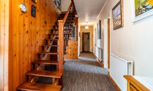Approached via a UPVC double-glazed entrance porch and a further aluminium-framed glazed inner door, the entrance hall immediately impresses with its generous proportions and sense of space. A striking open-tread staircase in rich hardwood rises to the first-floor galleried landing, creating an architectural focal point. The hallway is well-lit and welcoming, with two radiators providing warmth and comfort. Quality carpeting underfoot complements the neutral wall tones, and the space is further enhanced by natural light filtering through from multiple directions. This area sets the tone for the rest of the home, balancing character with practicality.