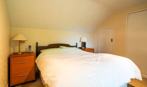 A spacious rear-aspect principal bedroom with delightful countryside views through a UPVC double-glazed window. The room features two built-in wardrobe cupboards, an eaves storage cupboard, and a radiator. Soft tones and sloped ceilings contribute to a peaceful, private atmosphere ideal for restful nights. This bedroom also benefits from direct access to a private en-suite, forming a comfortable and self-contained suite.