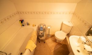 The en-suite is fitted with a panel-enclosed bath, low-level WC, and a pedestal wash hand basin with storage surround. Part-tiled walls and neutral décor keep the space bright and fresh, while an extractor fan ensures good ventilation. A practical and private bathroom, well-suited to the principal suite.