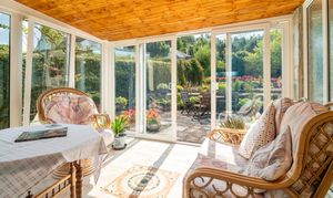 Across the quiet lane is a spectacular two-acre garden with mature trees, lawned areas, a summerhouse, greenhouse, detached garage, and wildlife pond. Designed as a peaceful, semi-wild retreat with far-reaching countryside views and glimpses of the sea, this extraordinary plot adds real value and lifestyle appeal to the property.