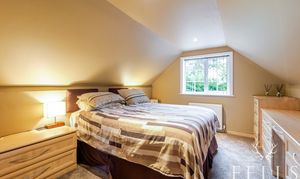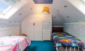 Upstairs, the landing leads to two further double bedrooms — one with fitted furniture and the other with twin Velux skylights — together with a family bathroom and eaves storage.
