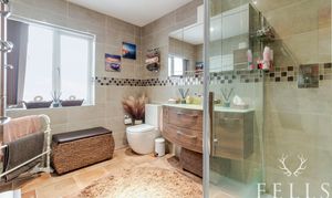 A versatile office connects from the living room, offering the flexibility to work from home or use as an alternative entrance. Also on the ground floor is a fully tiled shower room, a utility room with additional sink and appliance space, and a generous double bedroom with walk-in wardrobe and en-suite.
