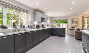 The heart of the home is the L-shaped kitchen and snug, designed as an inviting everyday space with fitted cabinets, integrated appliances and a breakfast bar for casual dining. A bay window seat creates a cosy corner overlooking the garden, while a glazed door opens out to a brick patio — ideal for morning coffee or relaxed summer suppers.