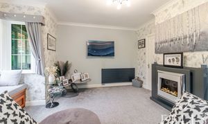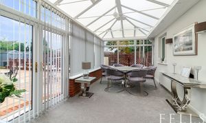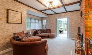 The adjoining living room is a comfortable retreat, featuring a brick-built fireplace with a gas fire and views across the rear garden. Glazed French doors open into the conservatory, where natural light floods the space and frames a panoramic outlook over the grounds. From here, doors lead onto the extensive patio and lawn beyond.